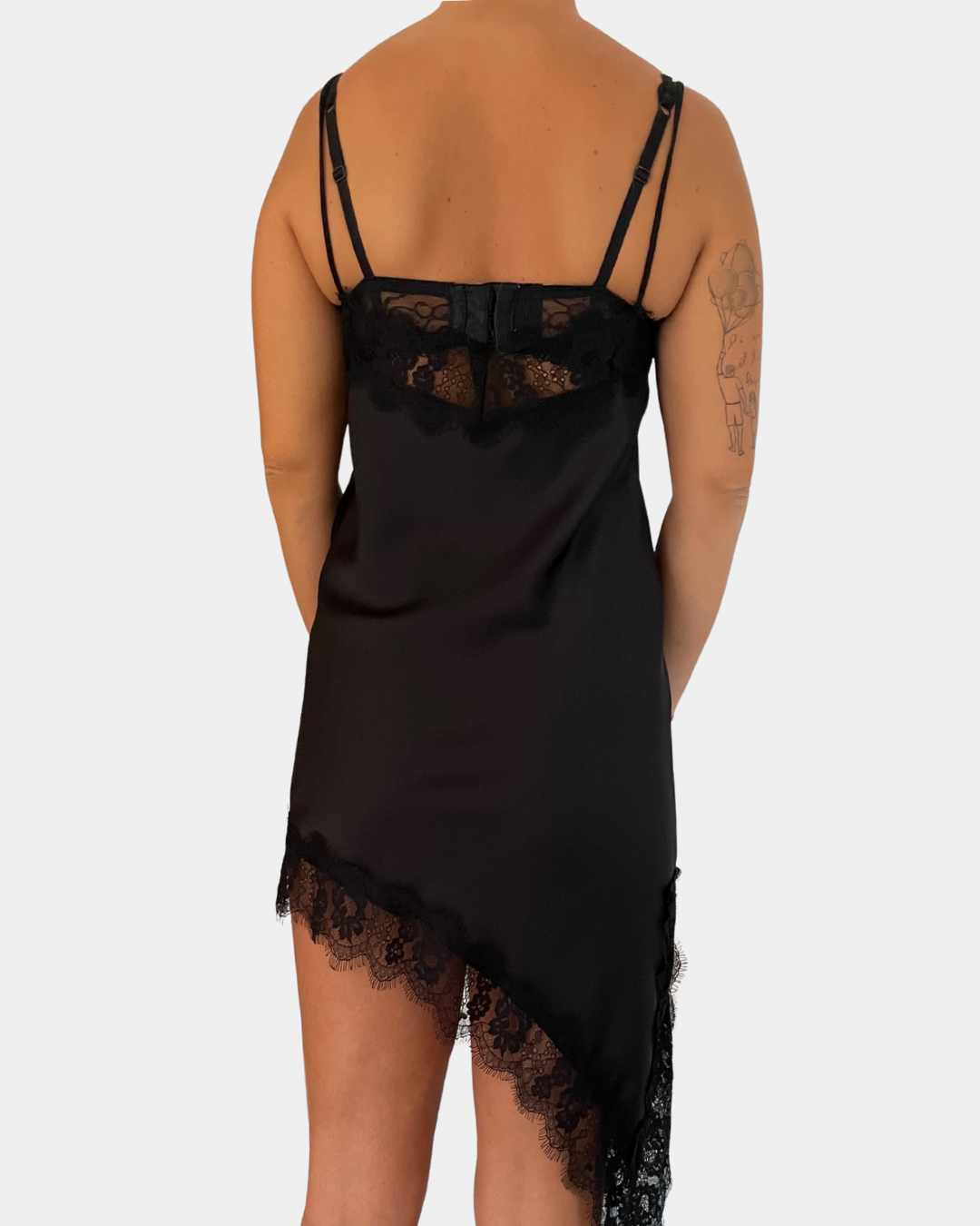 - Abito nero in satin con spalline sottili, spacco anteriore e rifinitura in pizzo