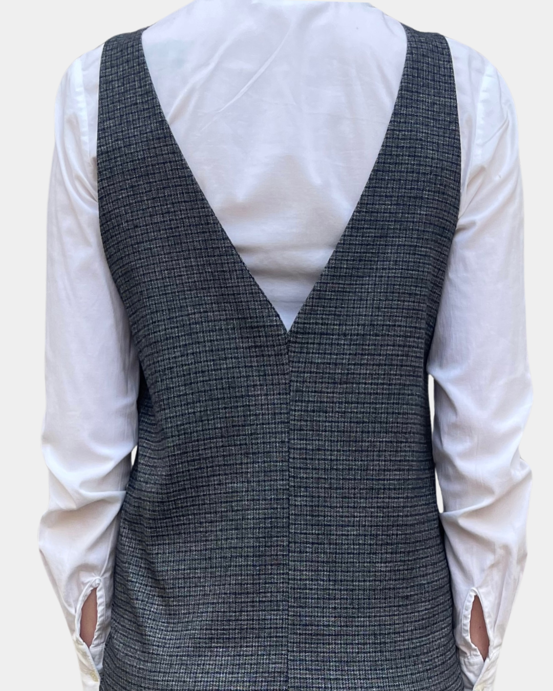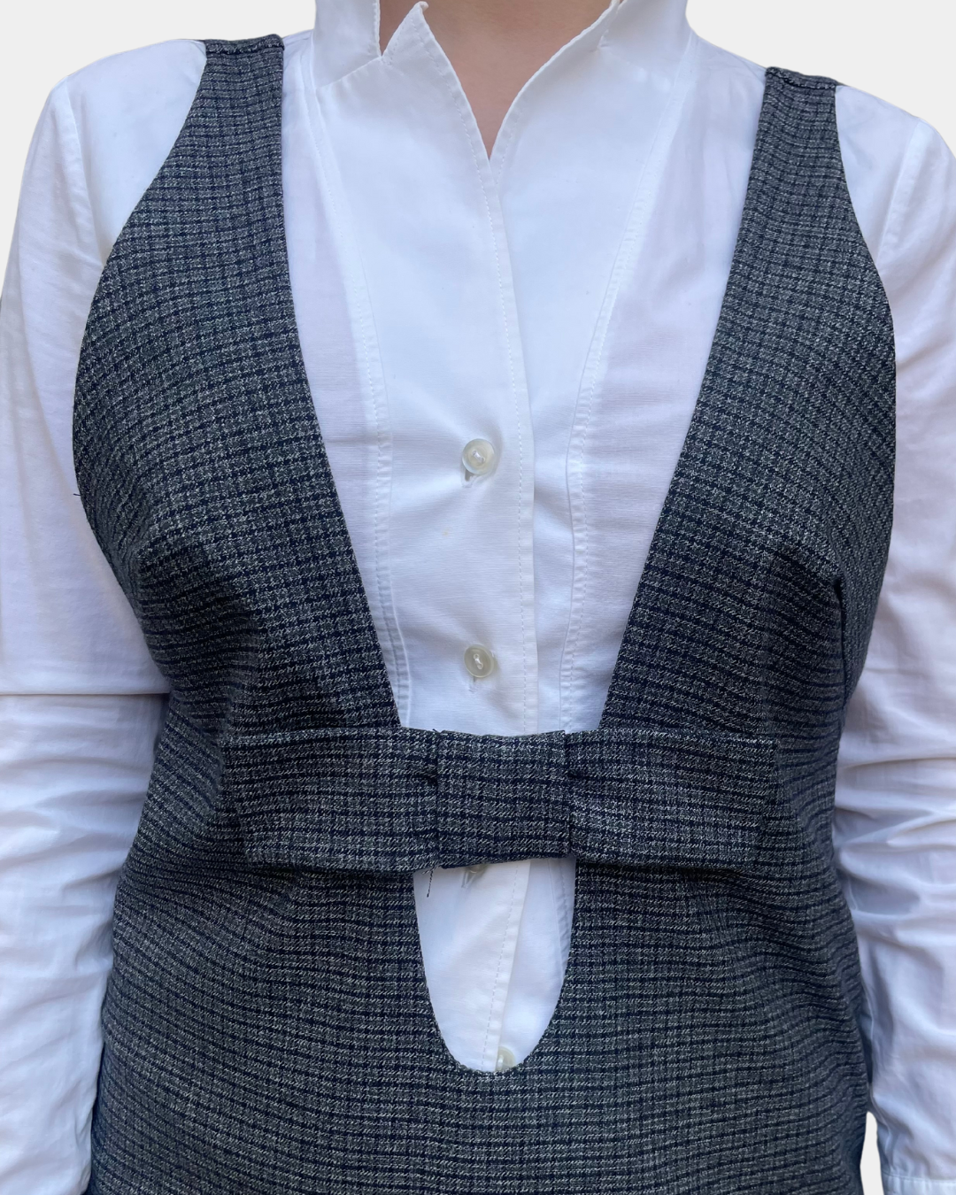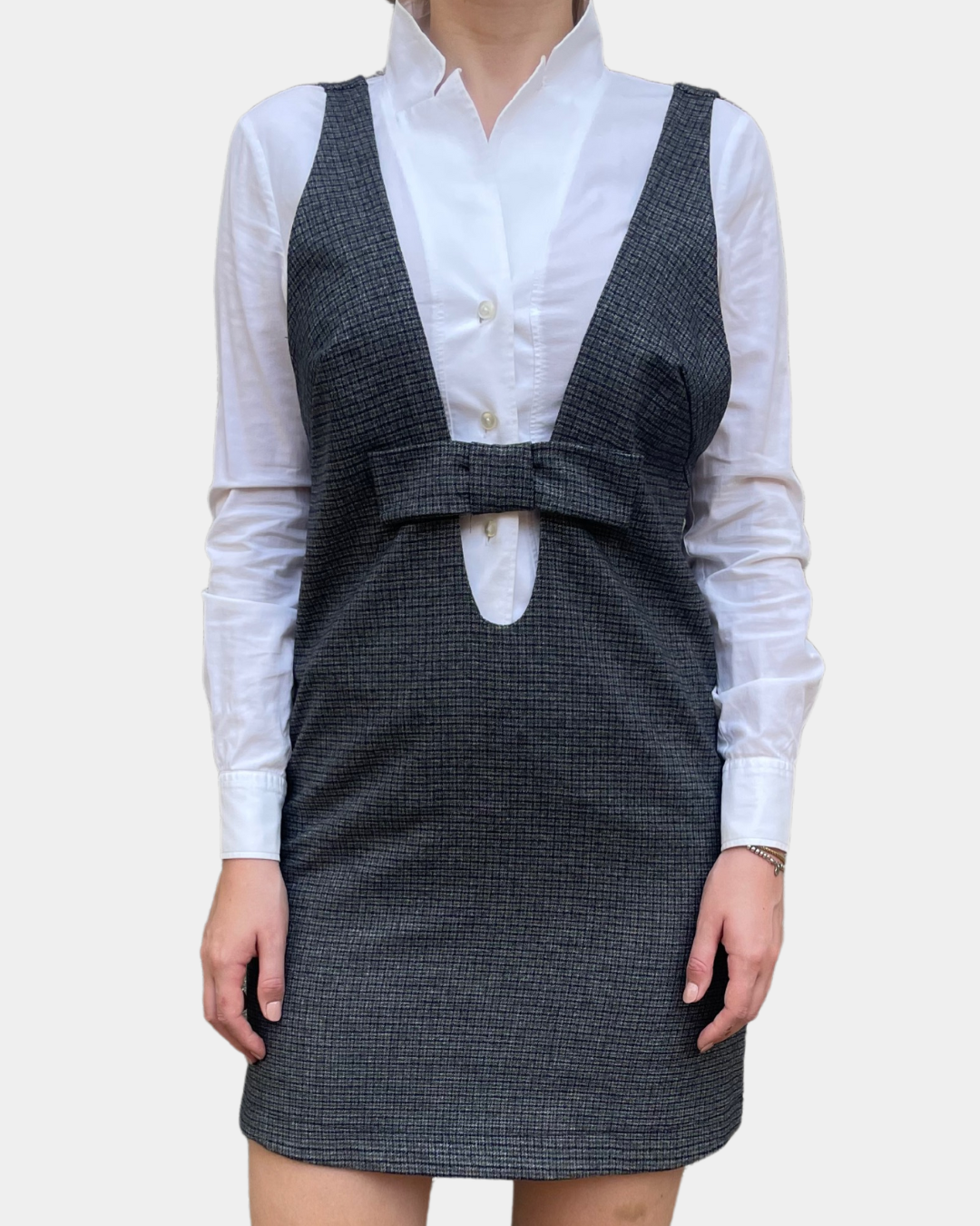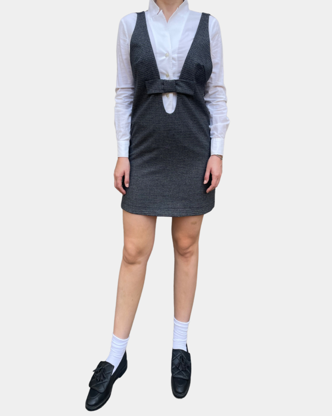 - Mini abito (privo di camicia) in tweed smanicato con scollo a V,  fiocco, pinces e scollatura posteriore a V