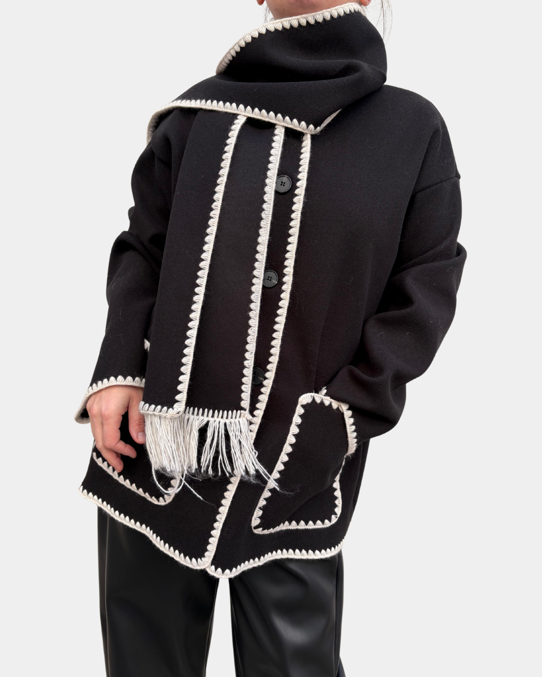 - Cappotto midi in panno con impunture a contrasto, sciarpa con frange, chiusura frontale con bottoni e due tasche applicate frontali