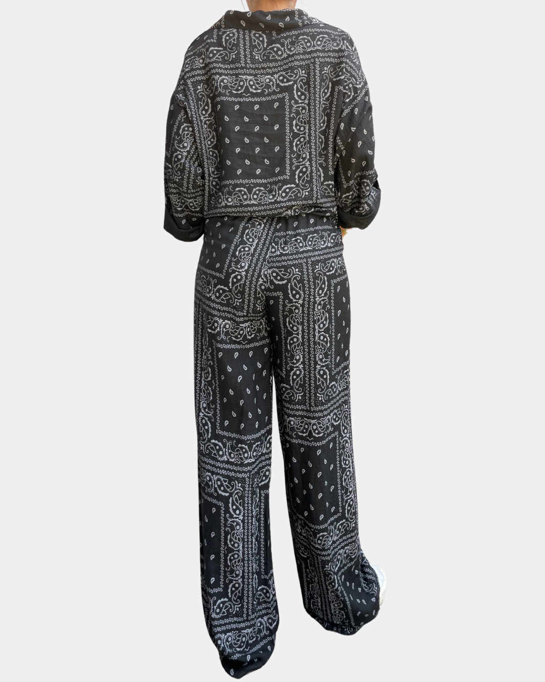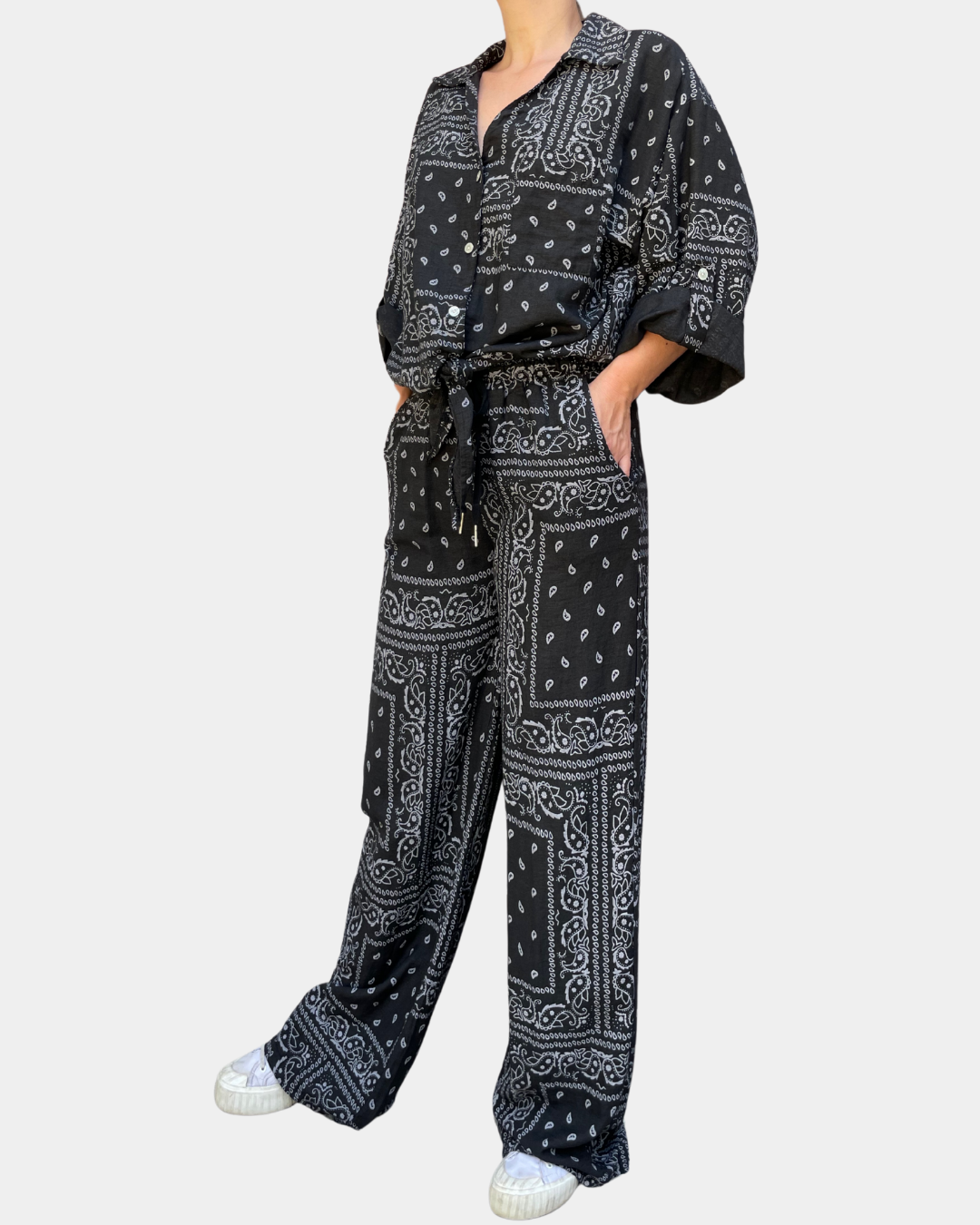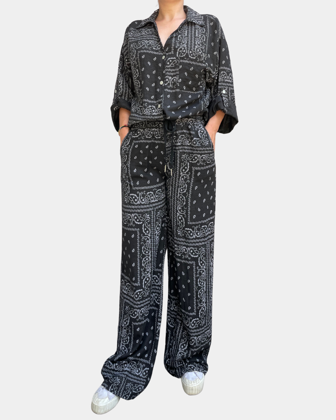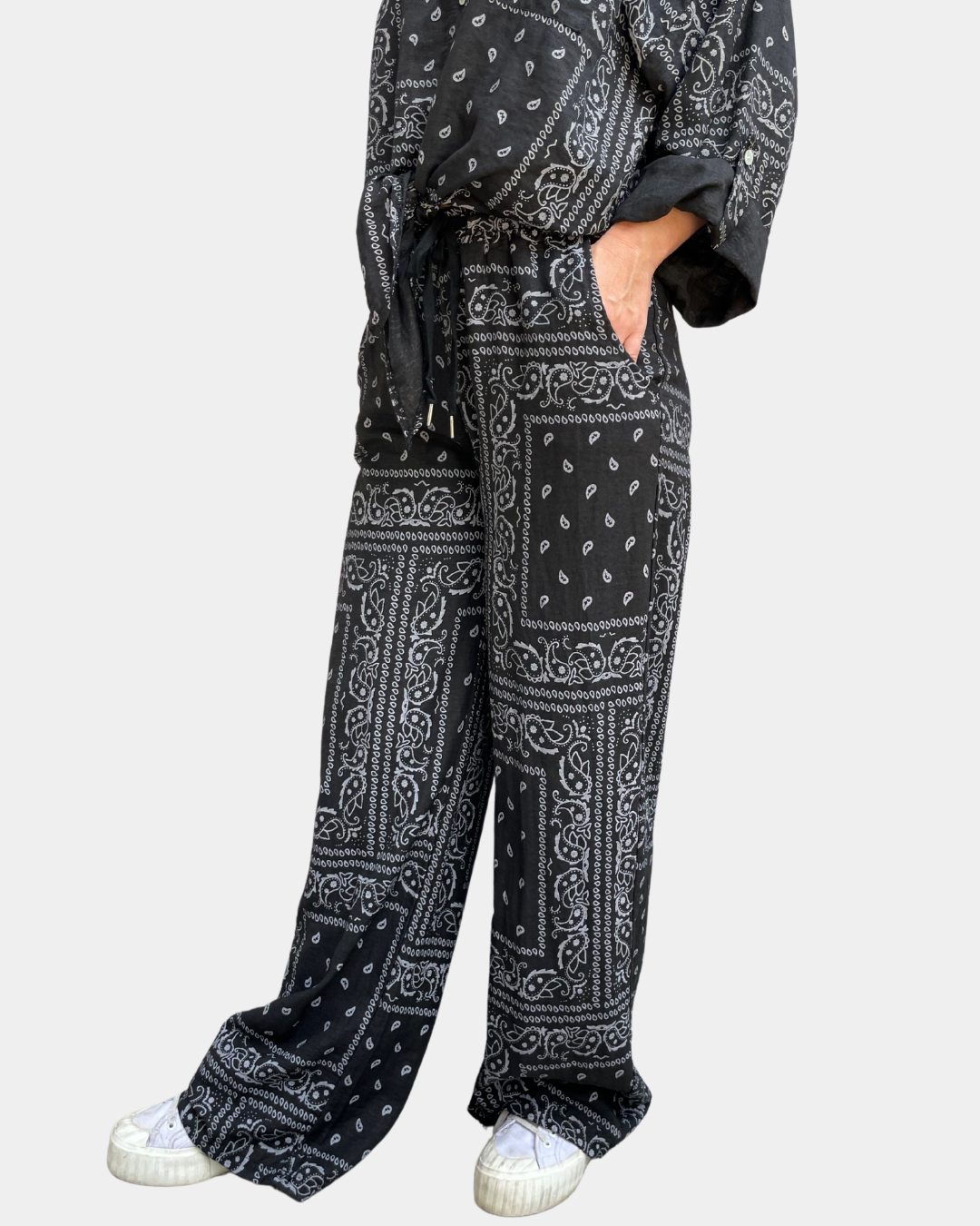 - Pantalone a gamba ampia con coulisse in vita e due tasche laterali filetto.