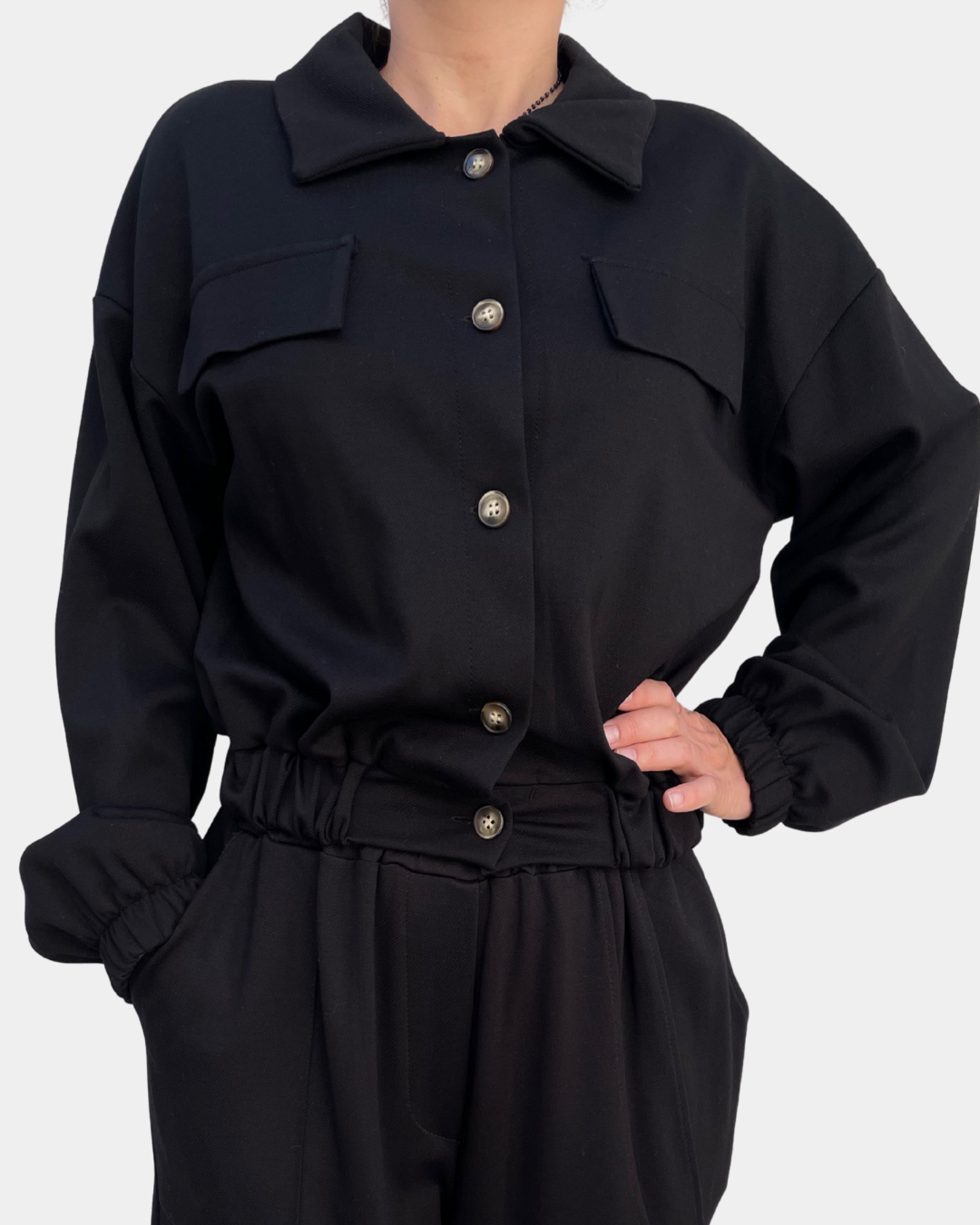 - Set coordinato composto da: camicia crop con elastico sul fondo e sul polsino, abbottonatura frontale, due tasche con patta frontali non funzionali e da pantalone modello ovetto, tessuto spinato, con elastico in vita e tasche filetto laterali