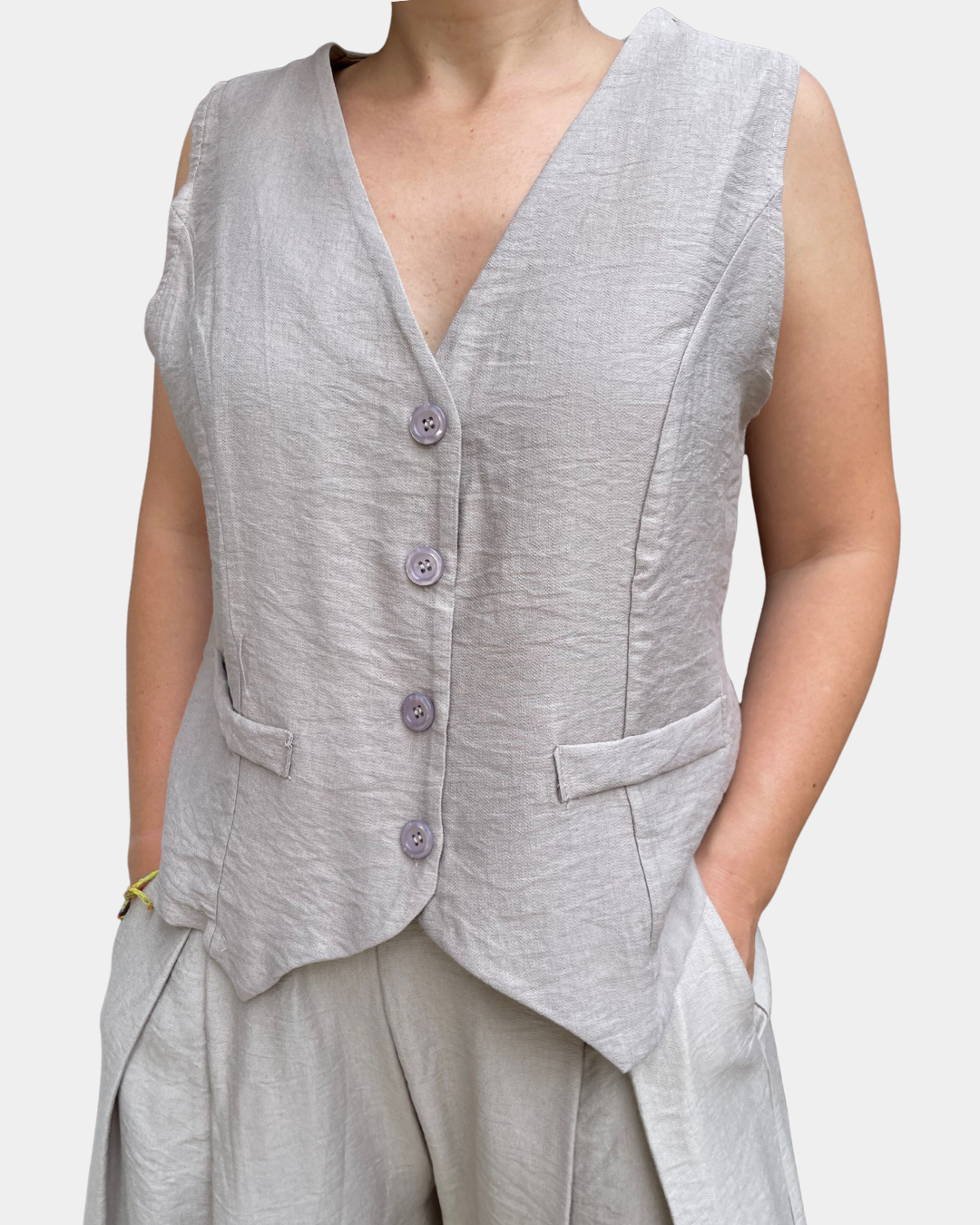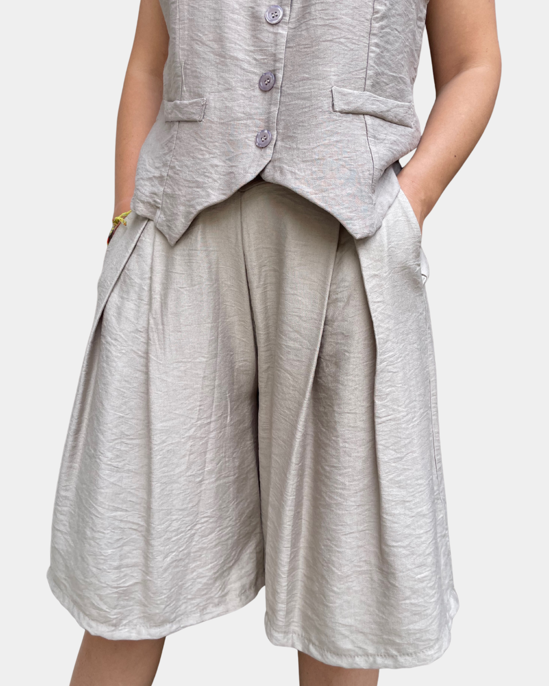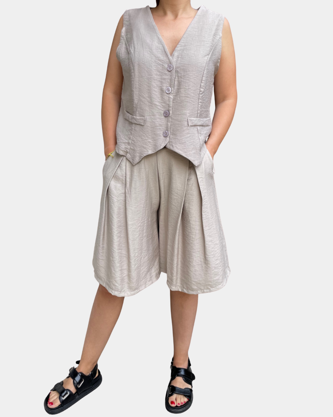 - Completo composto da gilet con abbottonatura frontale a bottoncini e bermuda con passanti in vita, cintura incorporata rimovibile, elastico sul retro, tasche laterali, gamba ampia