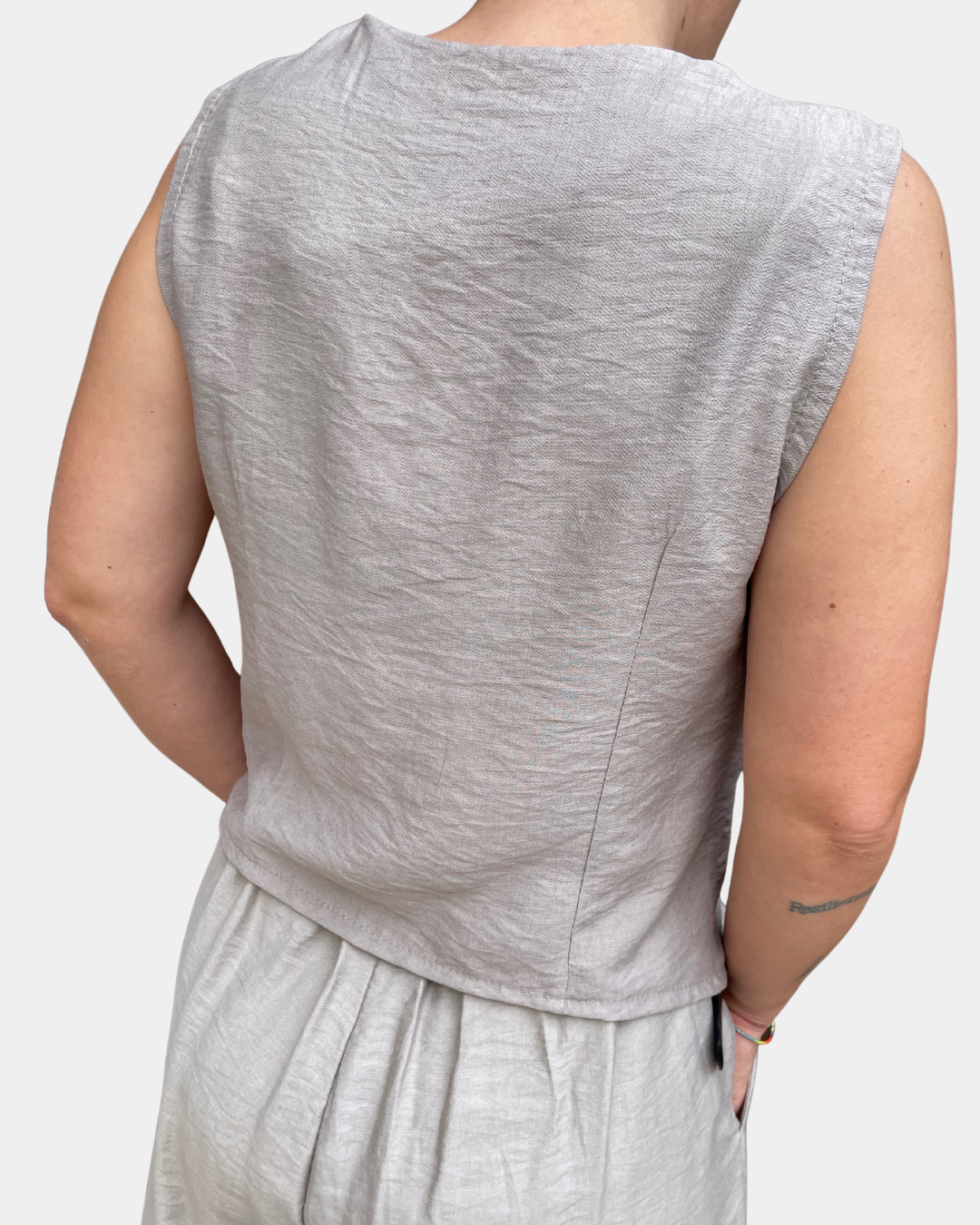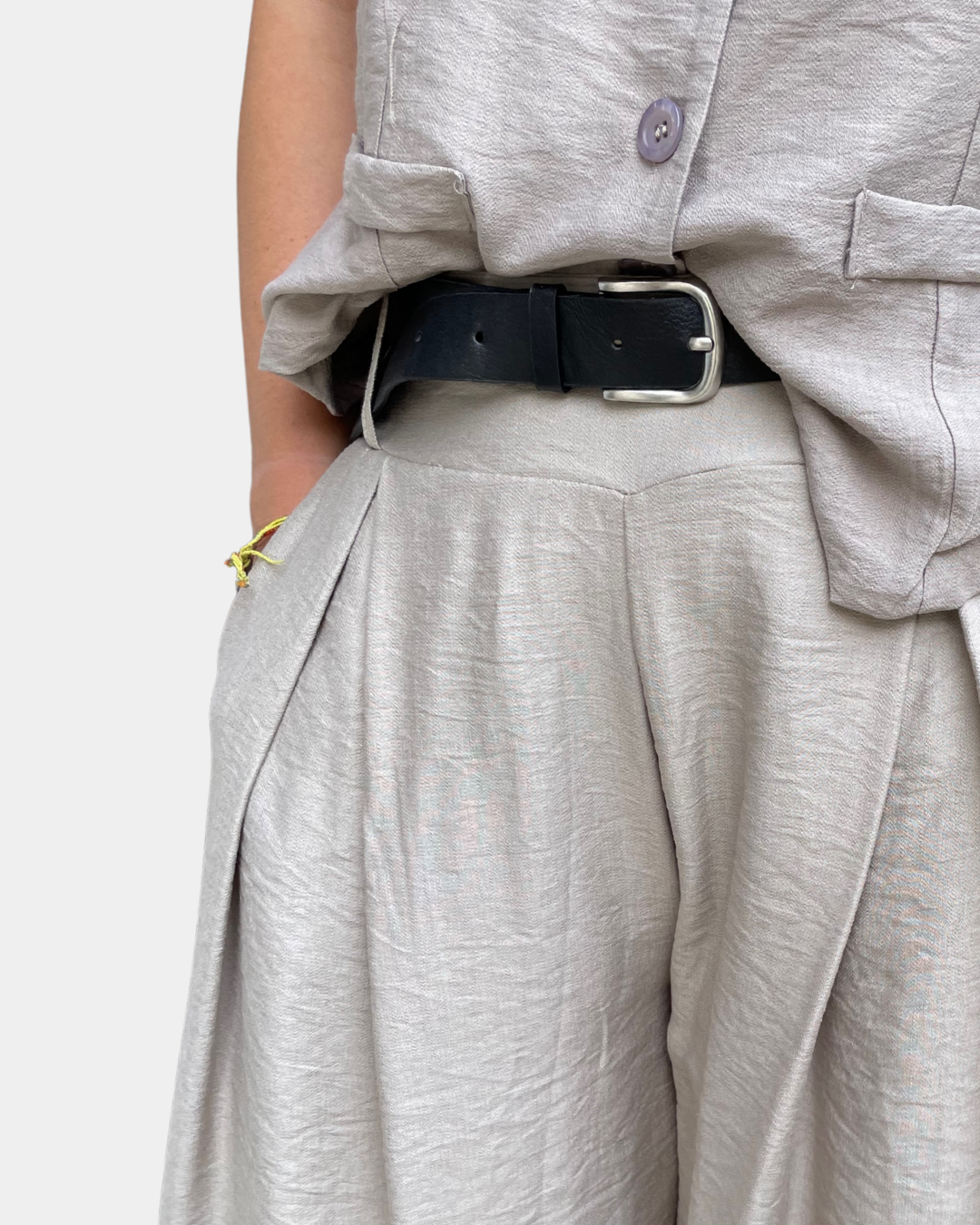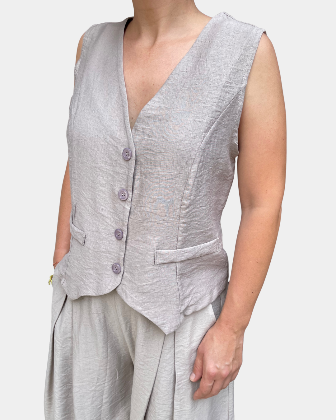 - Completo composto da gilet con abbottonatura frontale a bottoncini e bermuda con passanti in vita, cintura incorporata rimovibile, elastico sul retro, tasche laterali, gamba ampia