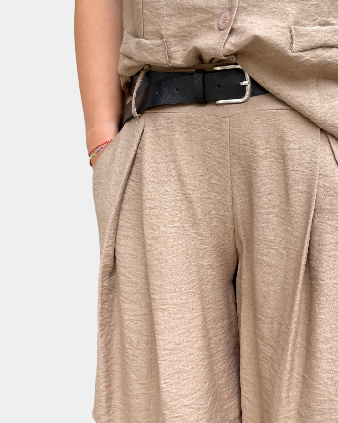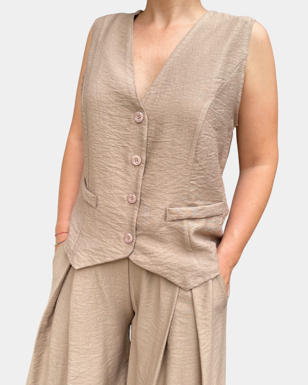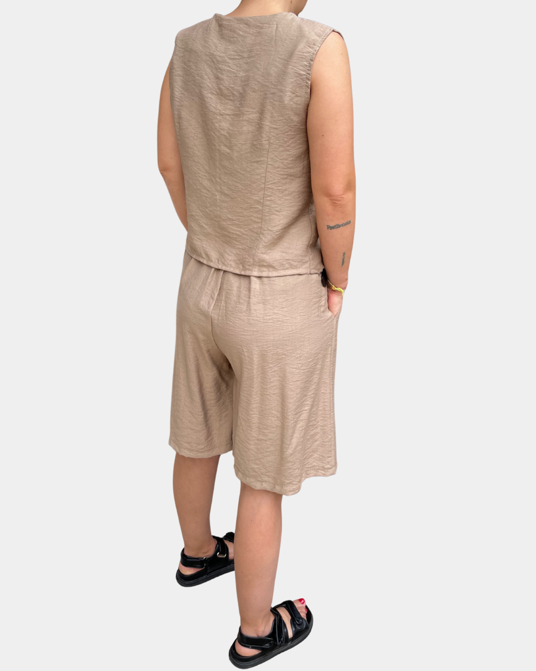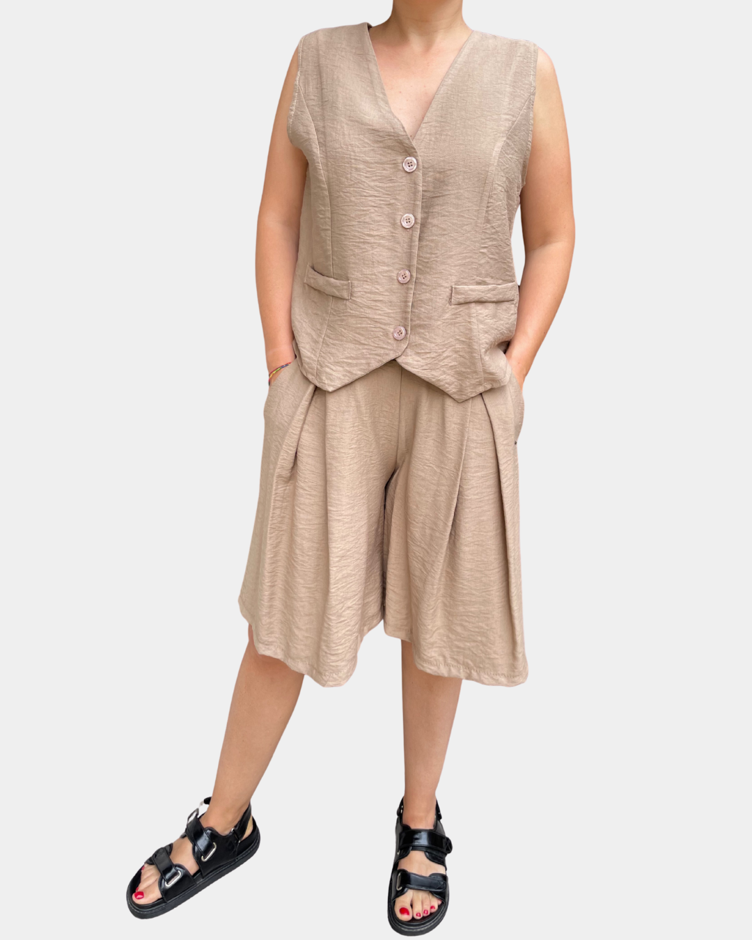 - Completo composto da gilet con abbottonatura frontale a bottoncini e bermuda con passanti in vita, cintura incorporata rimovibile, elastico sul retro, tasche laterali, gamba ampia