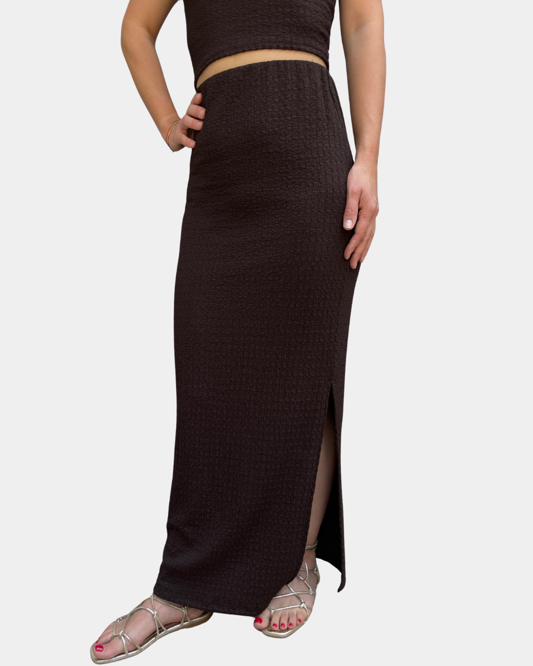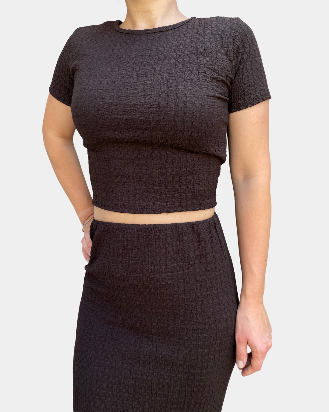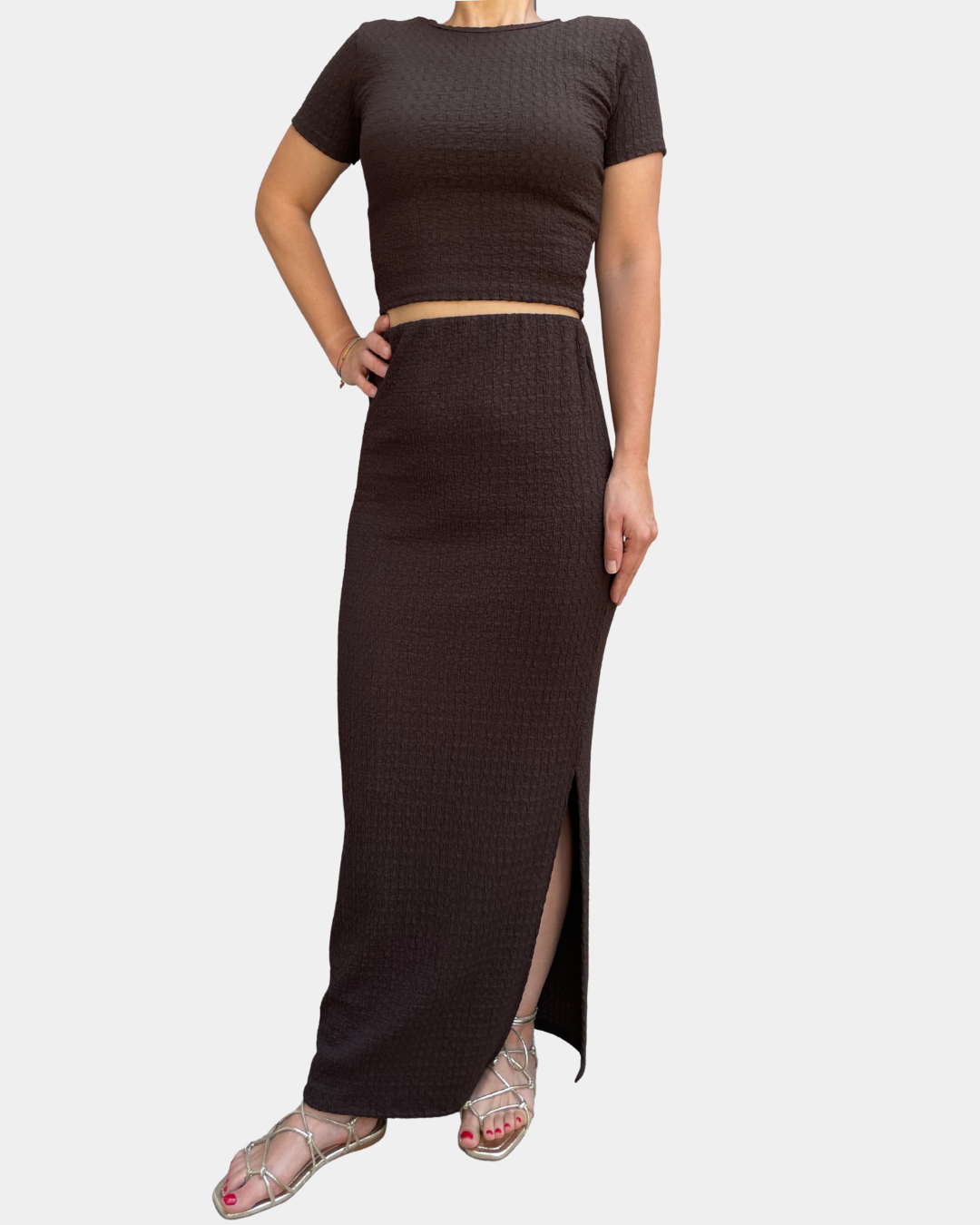 - Set maglia crop girocollo con gonna tubino con elastico in vita e spacco laterale