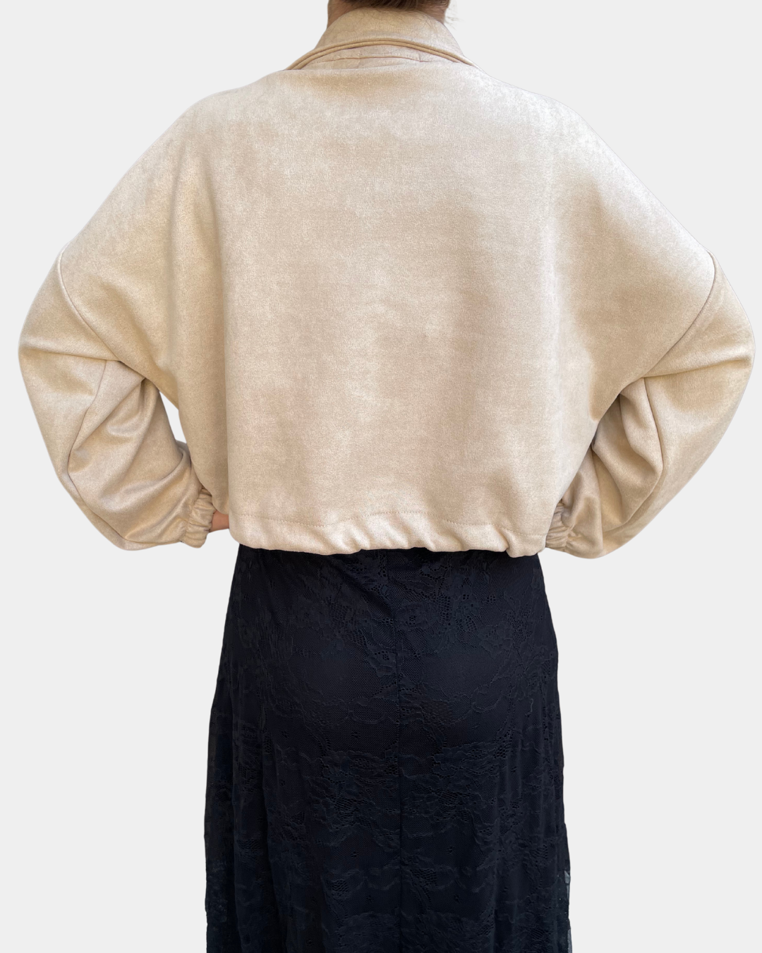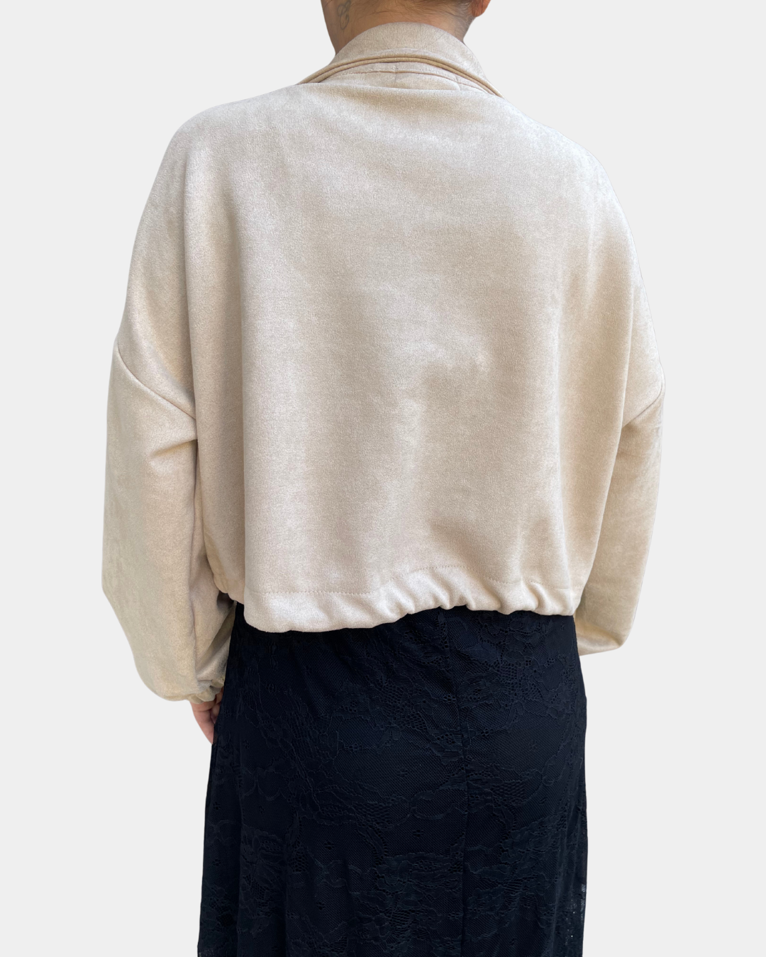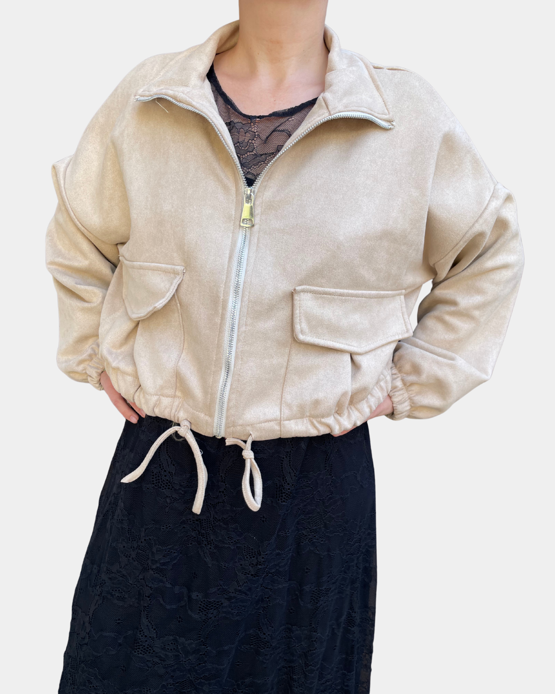- Giacca effetto suede, chiusura frontale con zip, tasche frontali con patta, fascia elastica sul polso, fondo elastico con coulisse regolabile