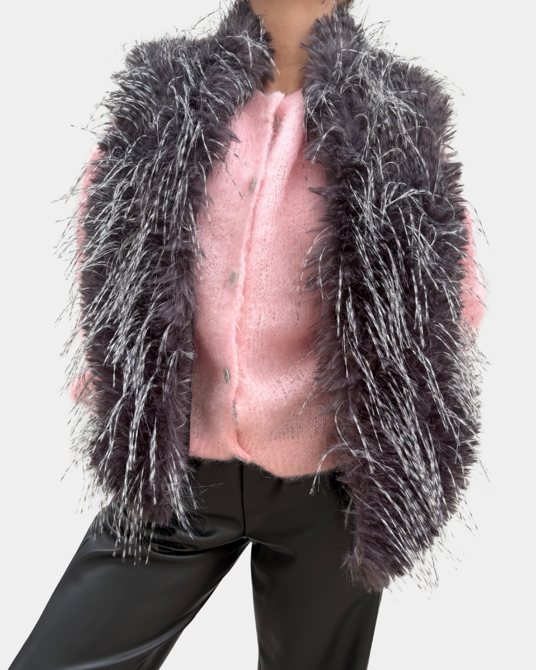 - Gilet in ecopelliccia, effetto piuma di struzzo, chiusura frontale con gancetti, due tasche laterali e fodera interna