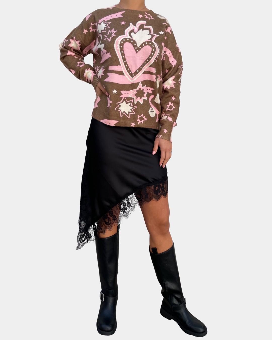 - Gonna lunghezza midi in satin, taglio asimmetrico con spacco anteriore, rifinitura in pizzo e elastico in vita