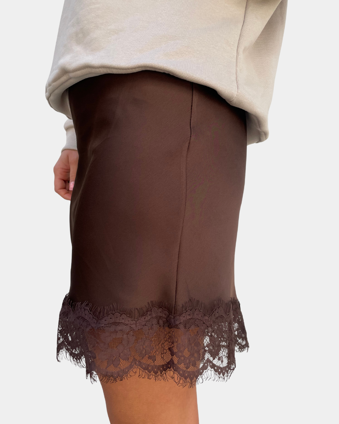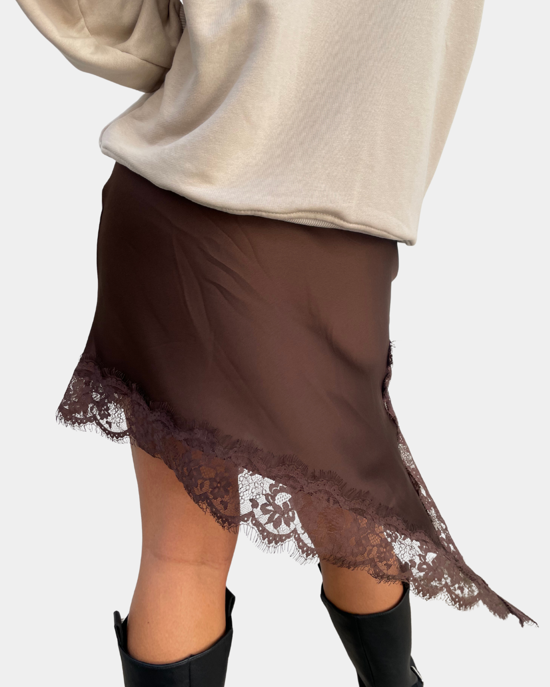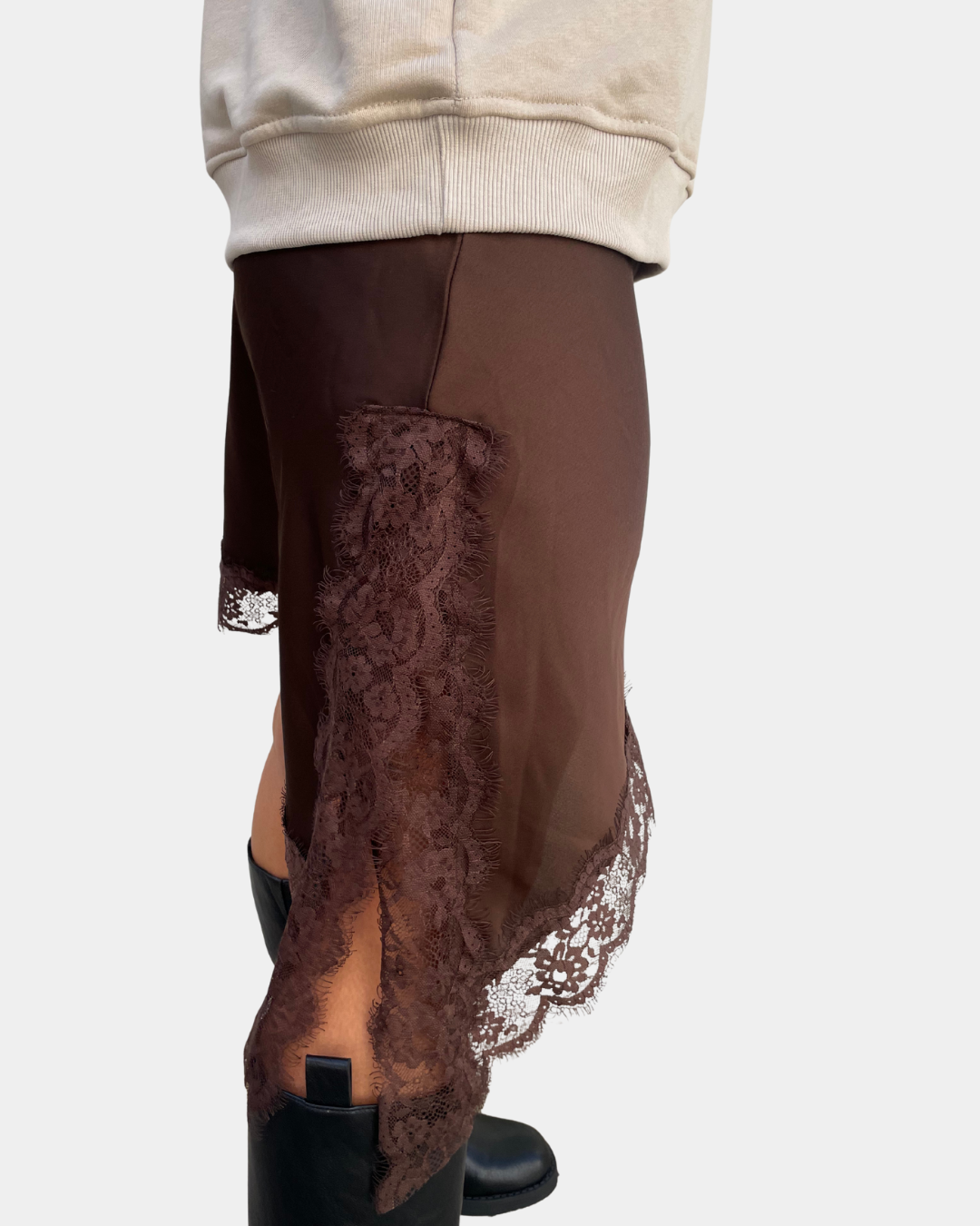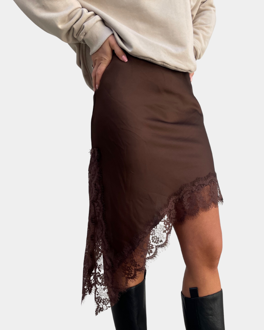 - Gonna lunghezza midi in satin, taglio asimmetrico con spacco anteriore, rifinitura in pizzo e elastico in vita