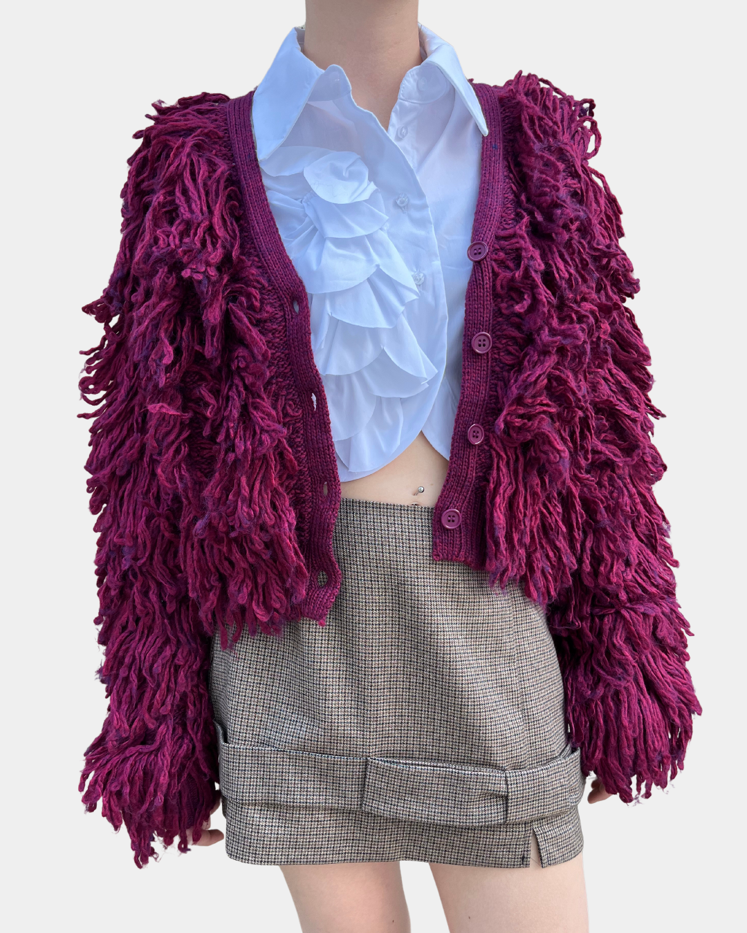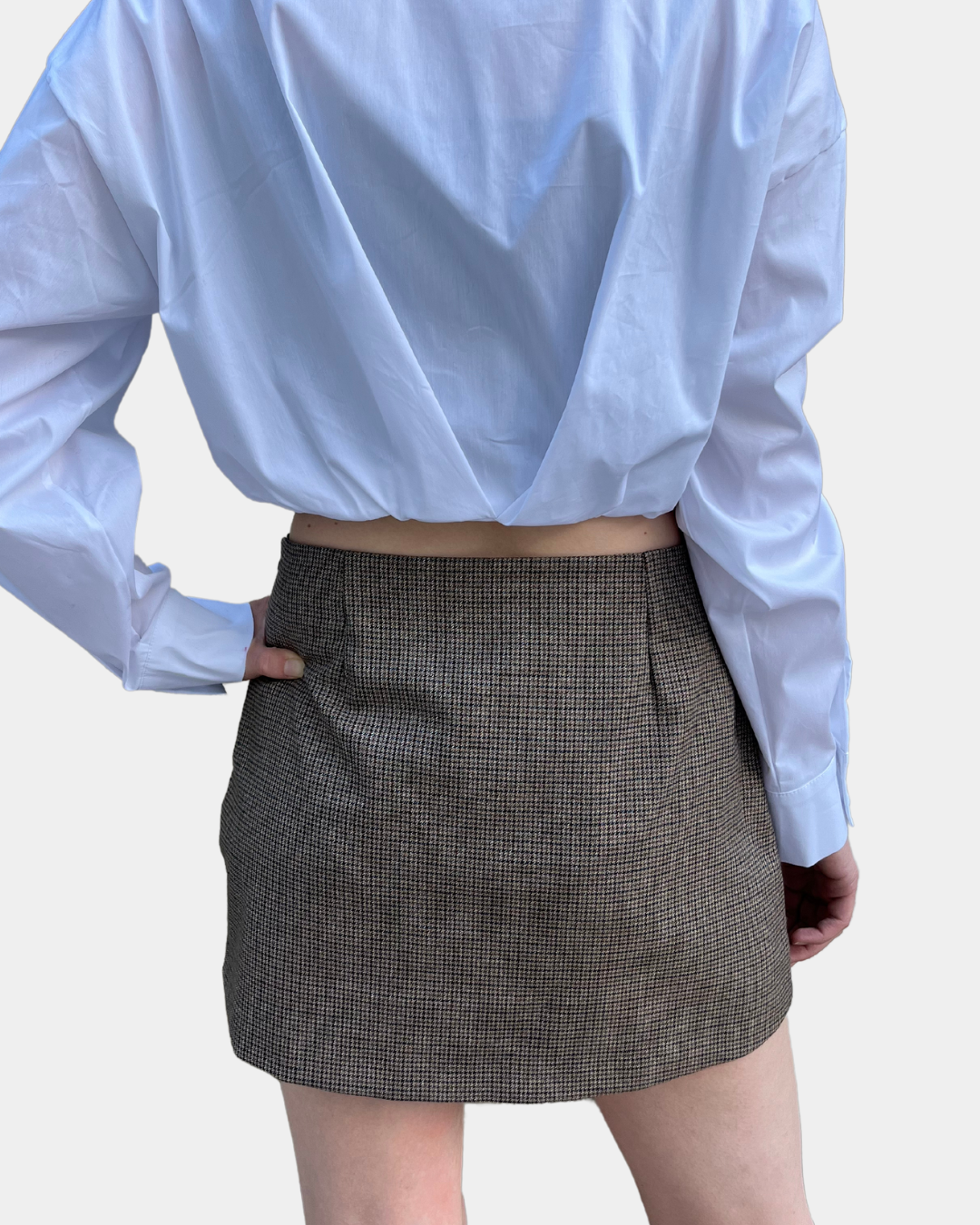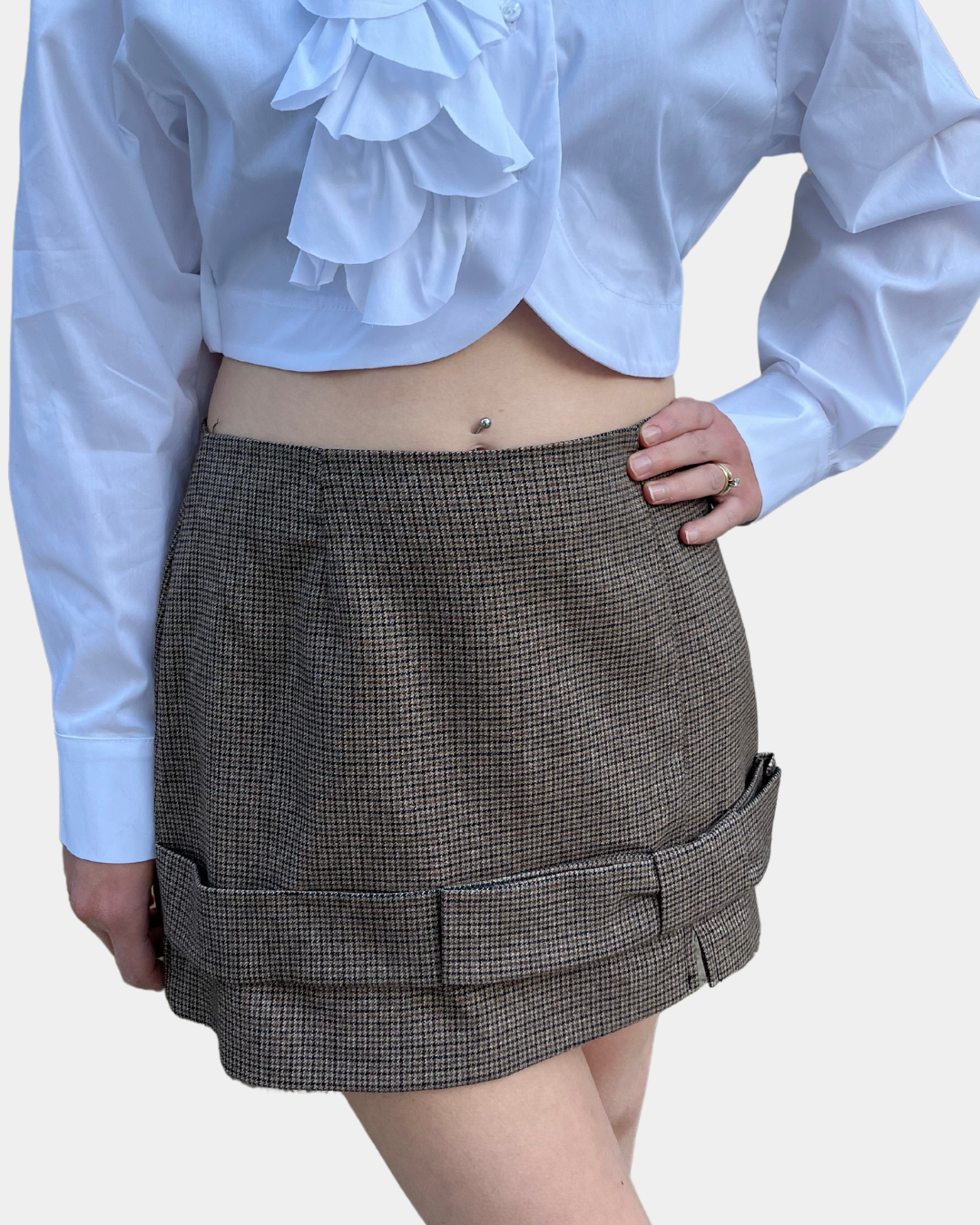 - Minigonna in tweed con pinces, chiusura con zip laterale, fiocco e mini spacco frontale