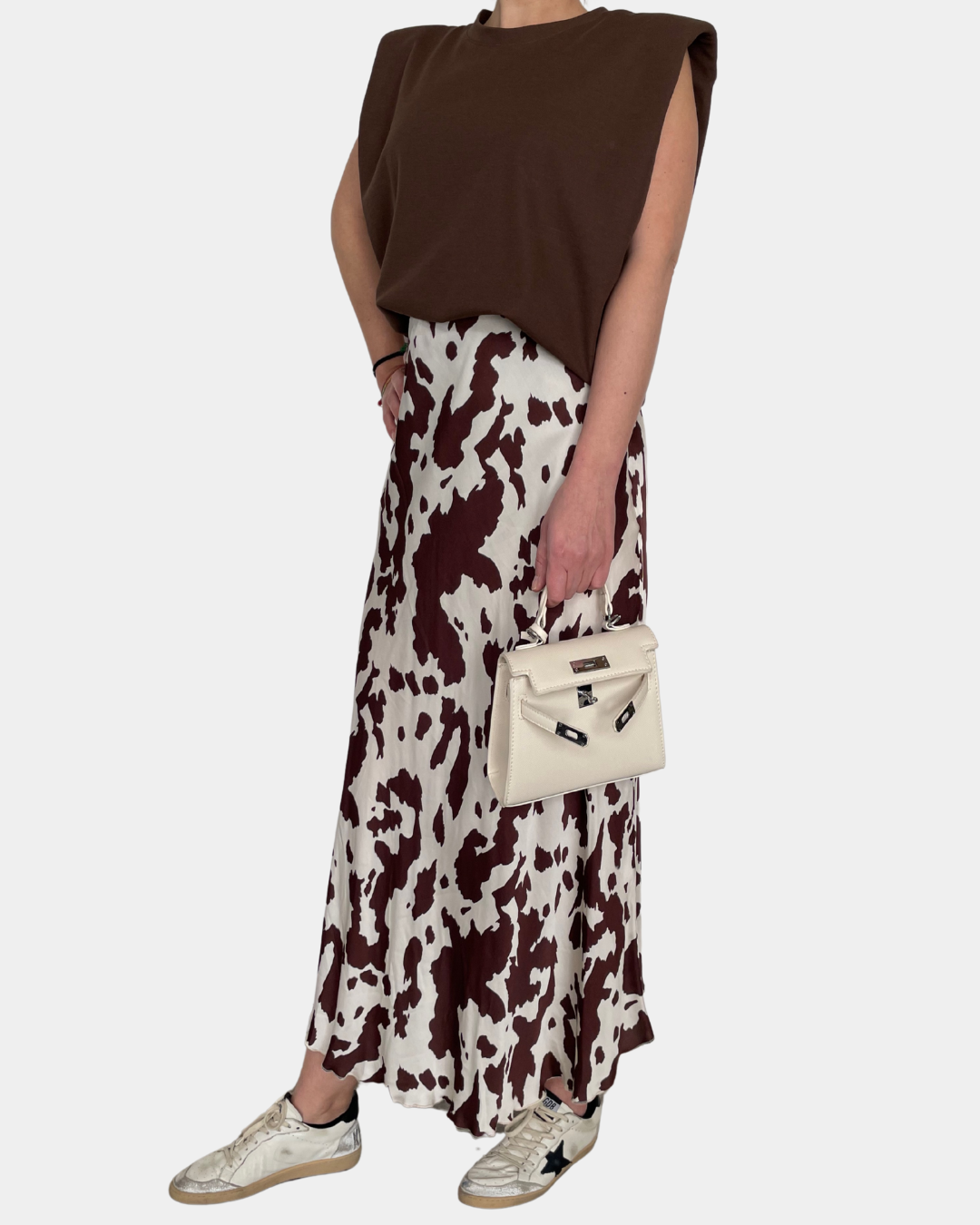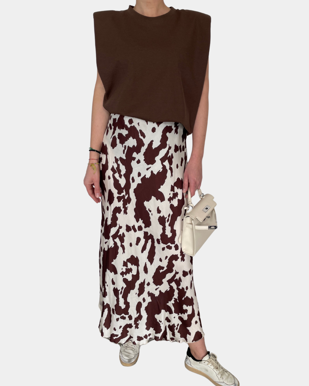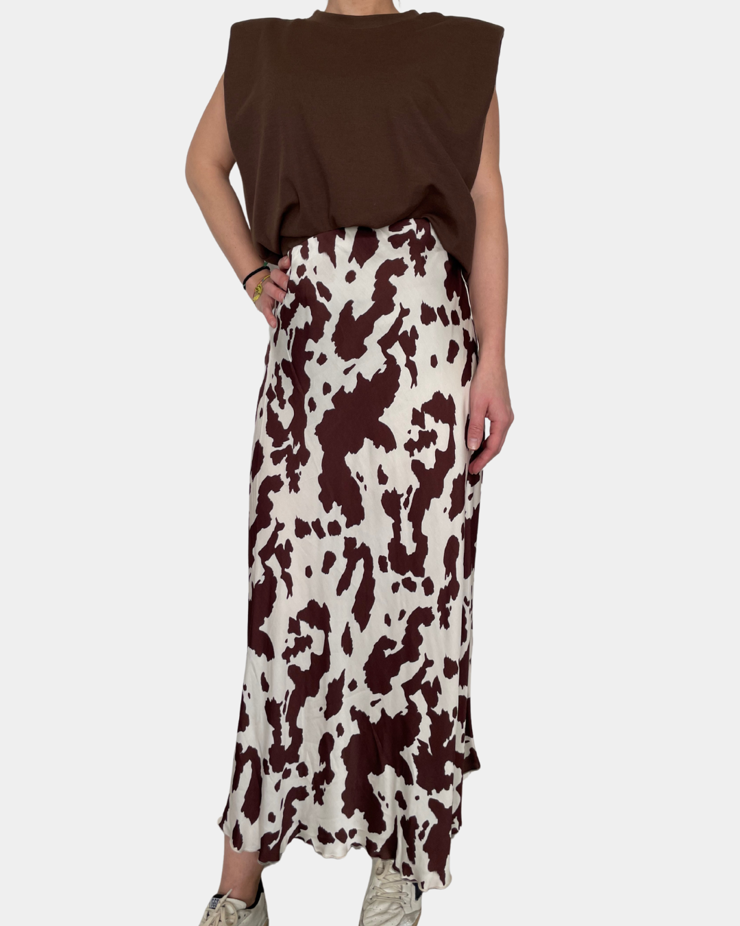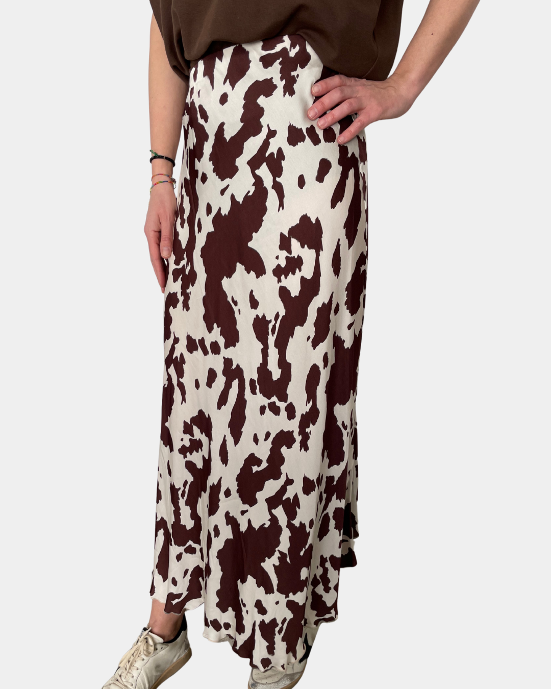 - Gonna satinata, stampa cow con elastico in vita