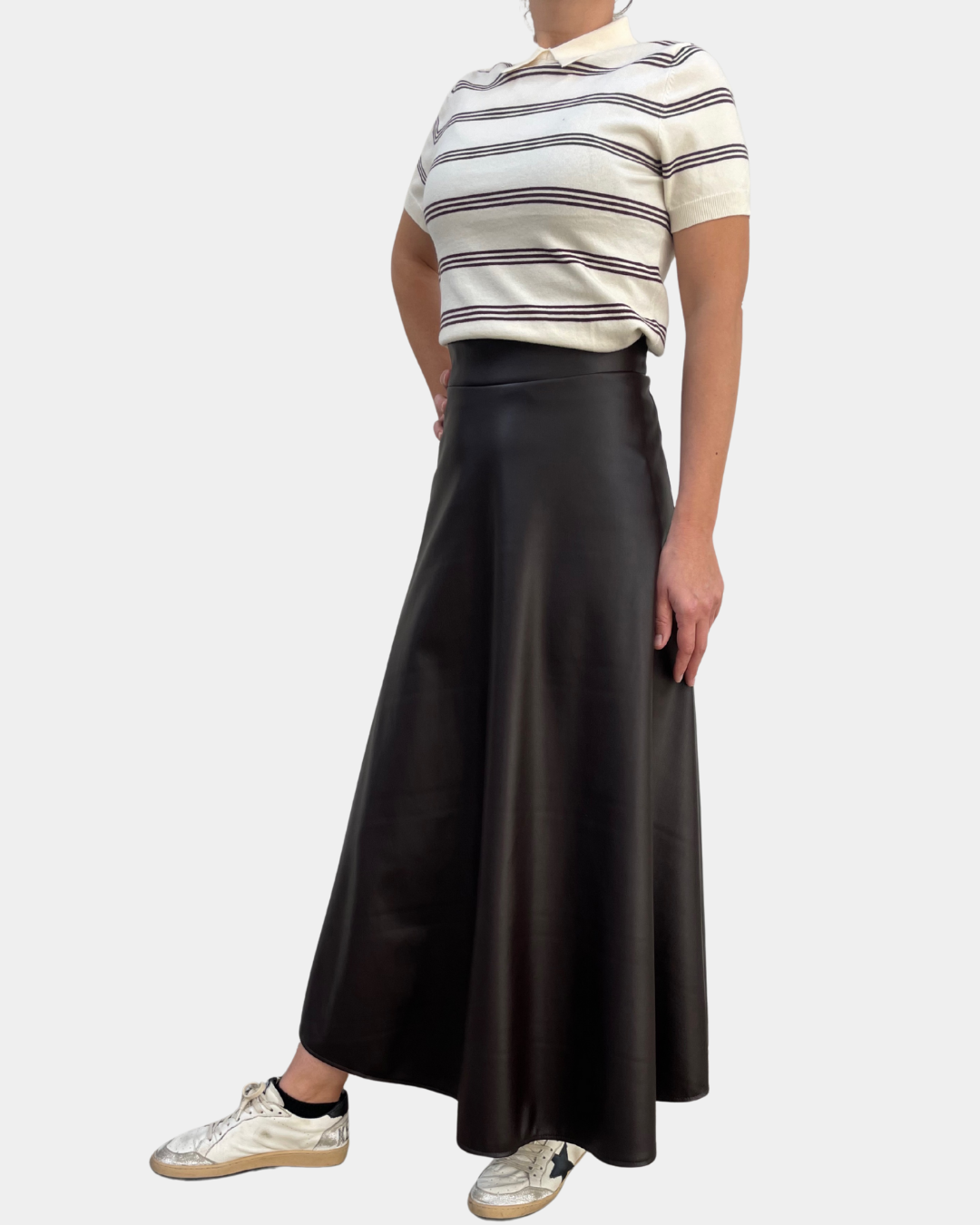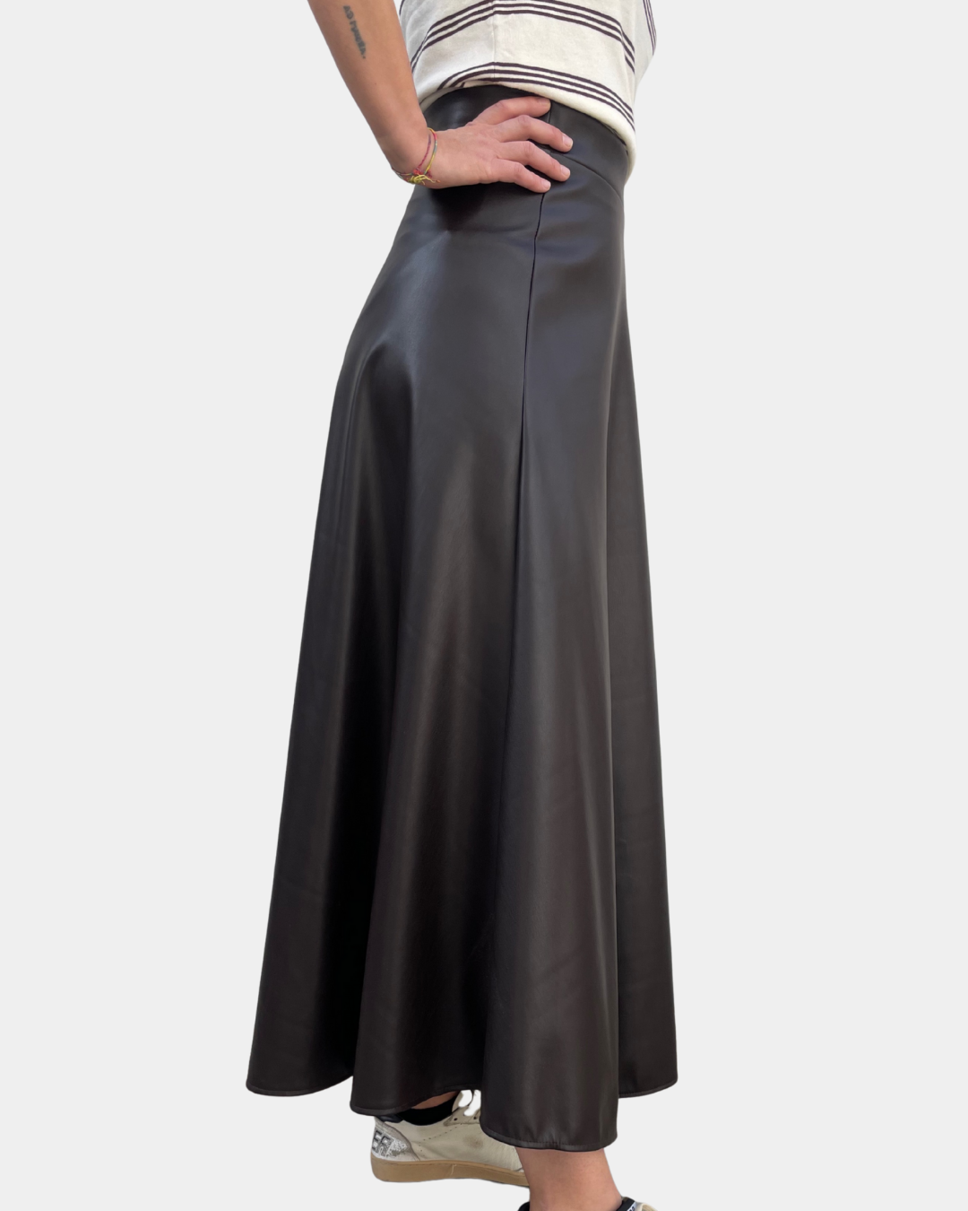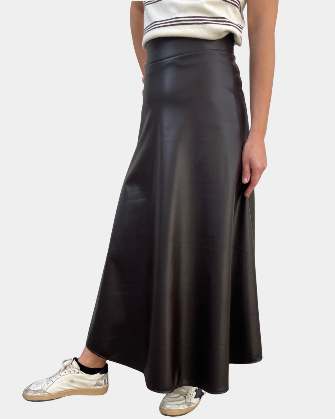 - Gonna in ecopelle modello midi con fascia elastica in vita, modello sfasato