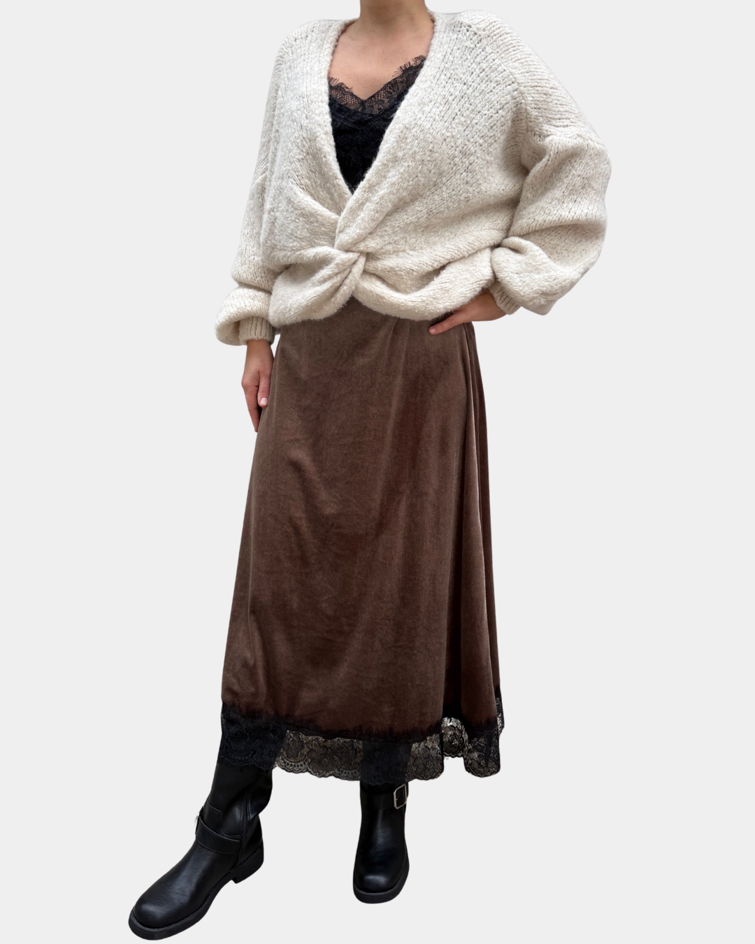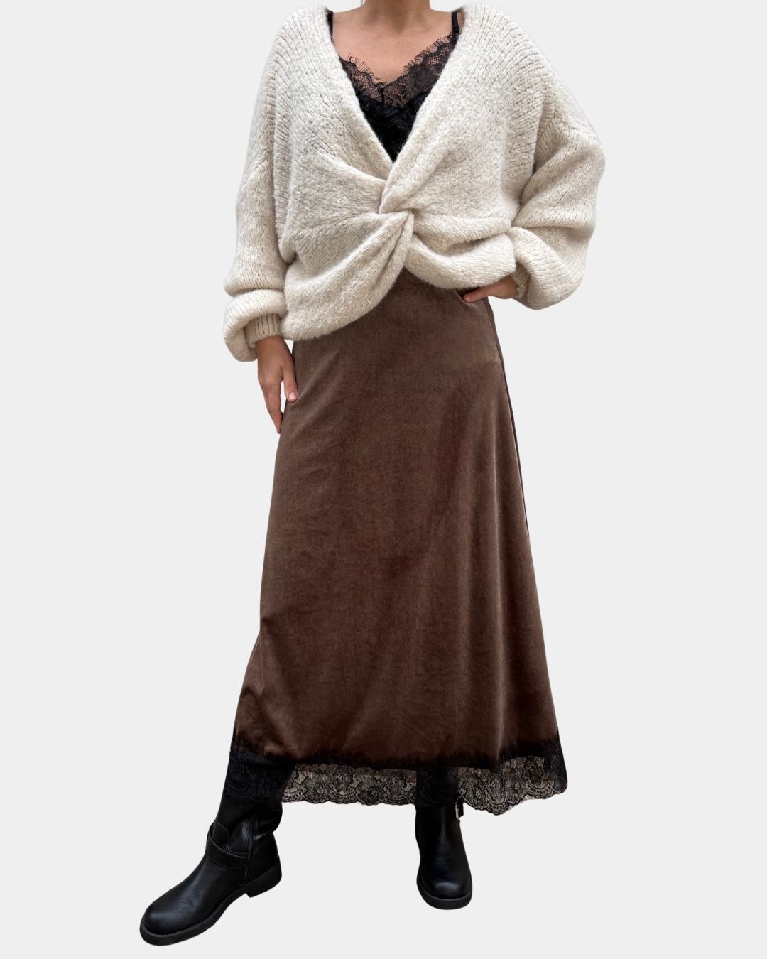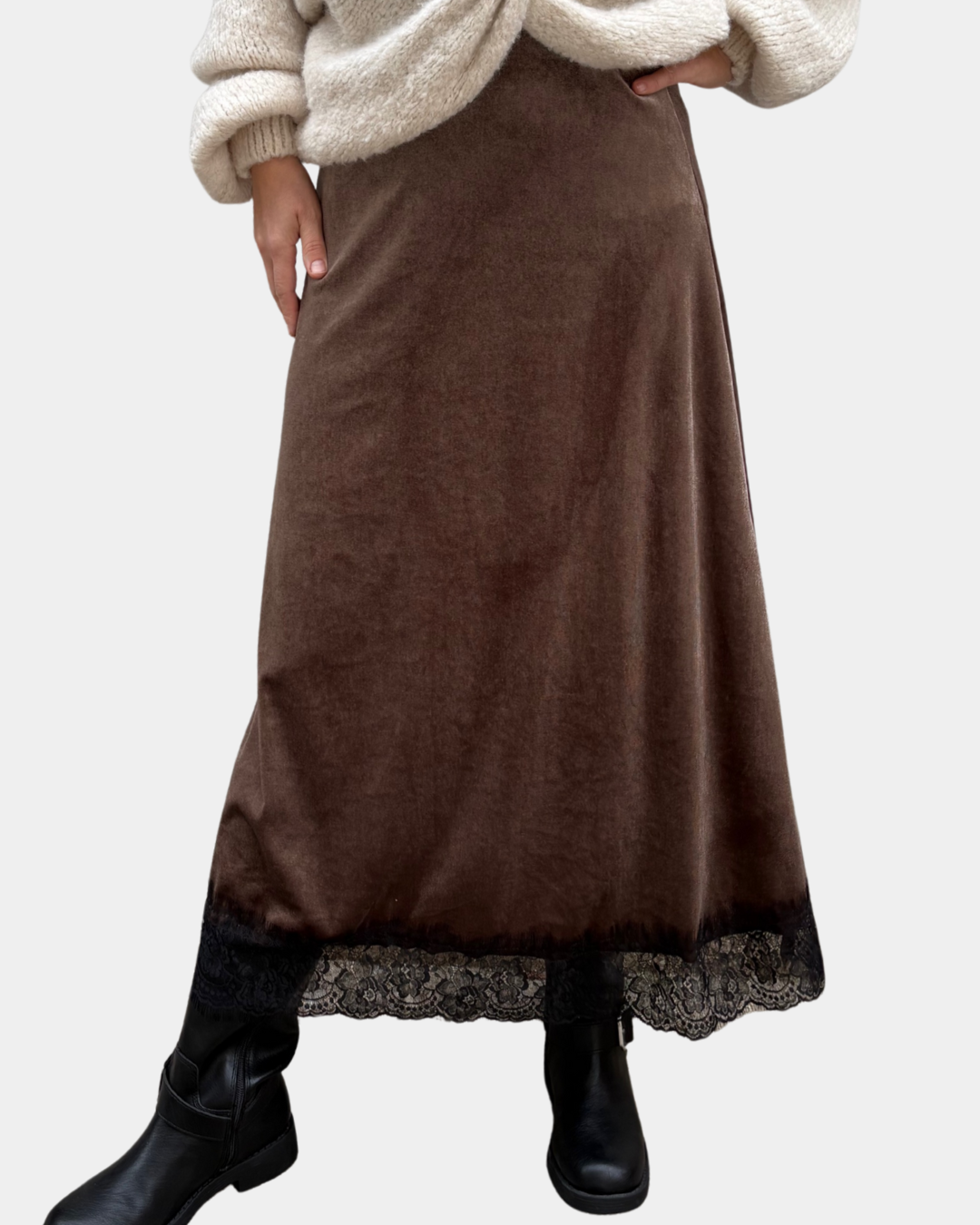 - Gonna midi a vita media, linea dritta, elastico in vita, in velluto con dettaglio applicazione pizzo a contrasto
