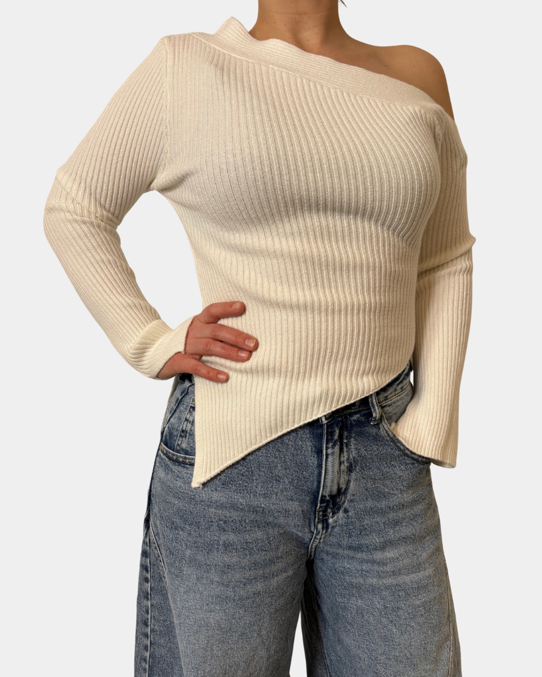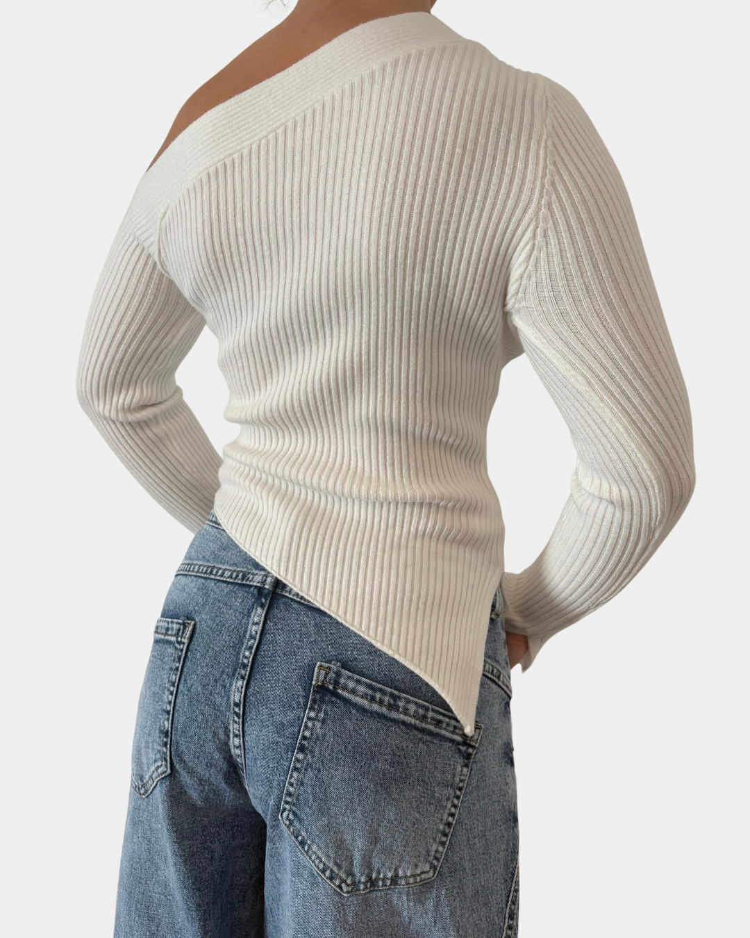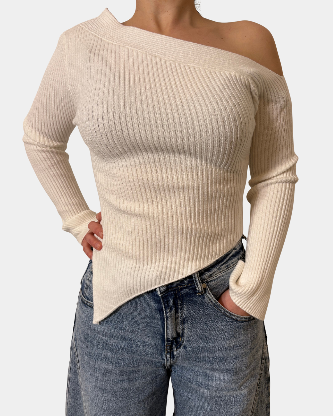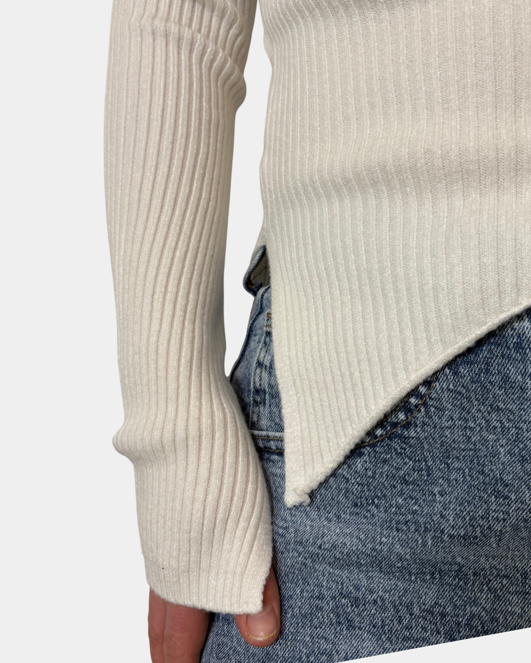 - Maglione a costina, taglio asimmetrico, manica lunga con spacco sul fondo