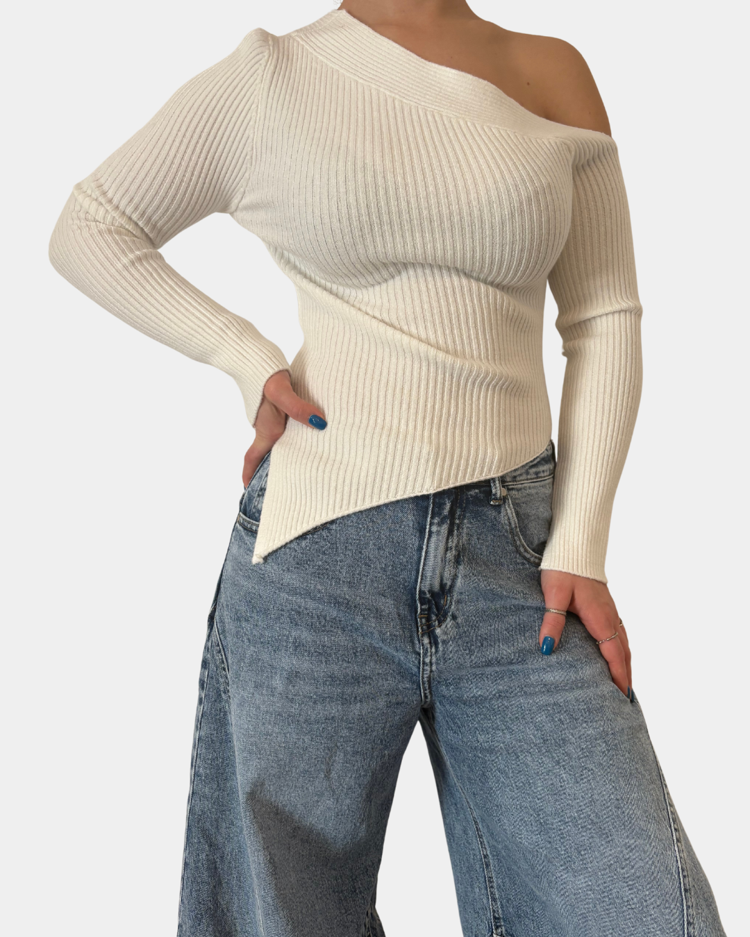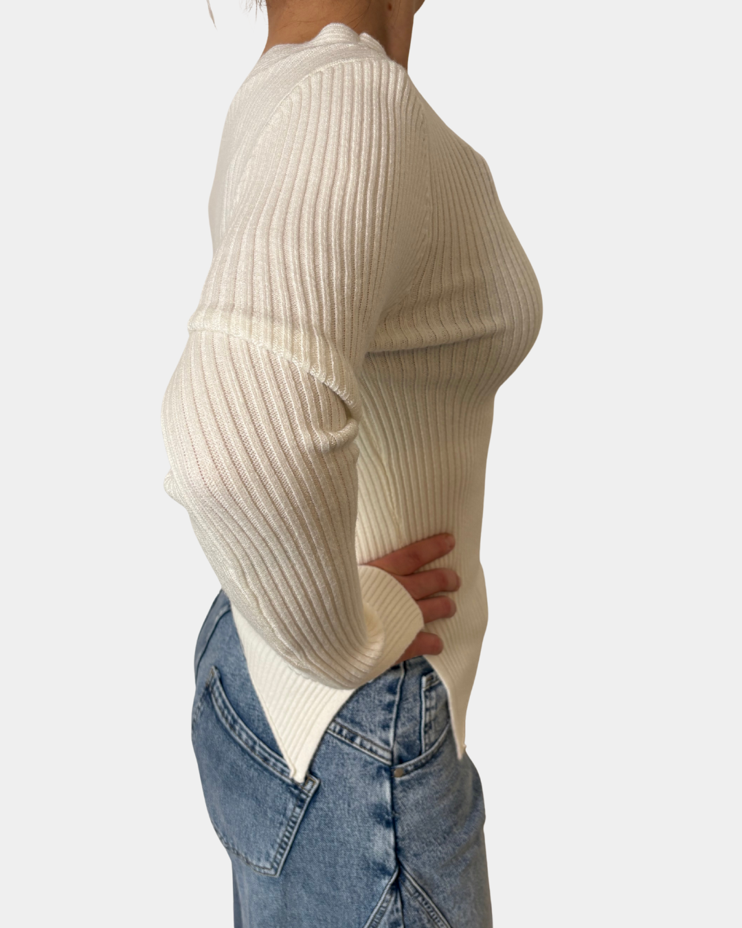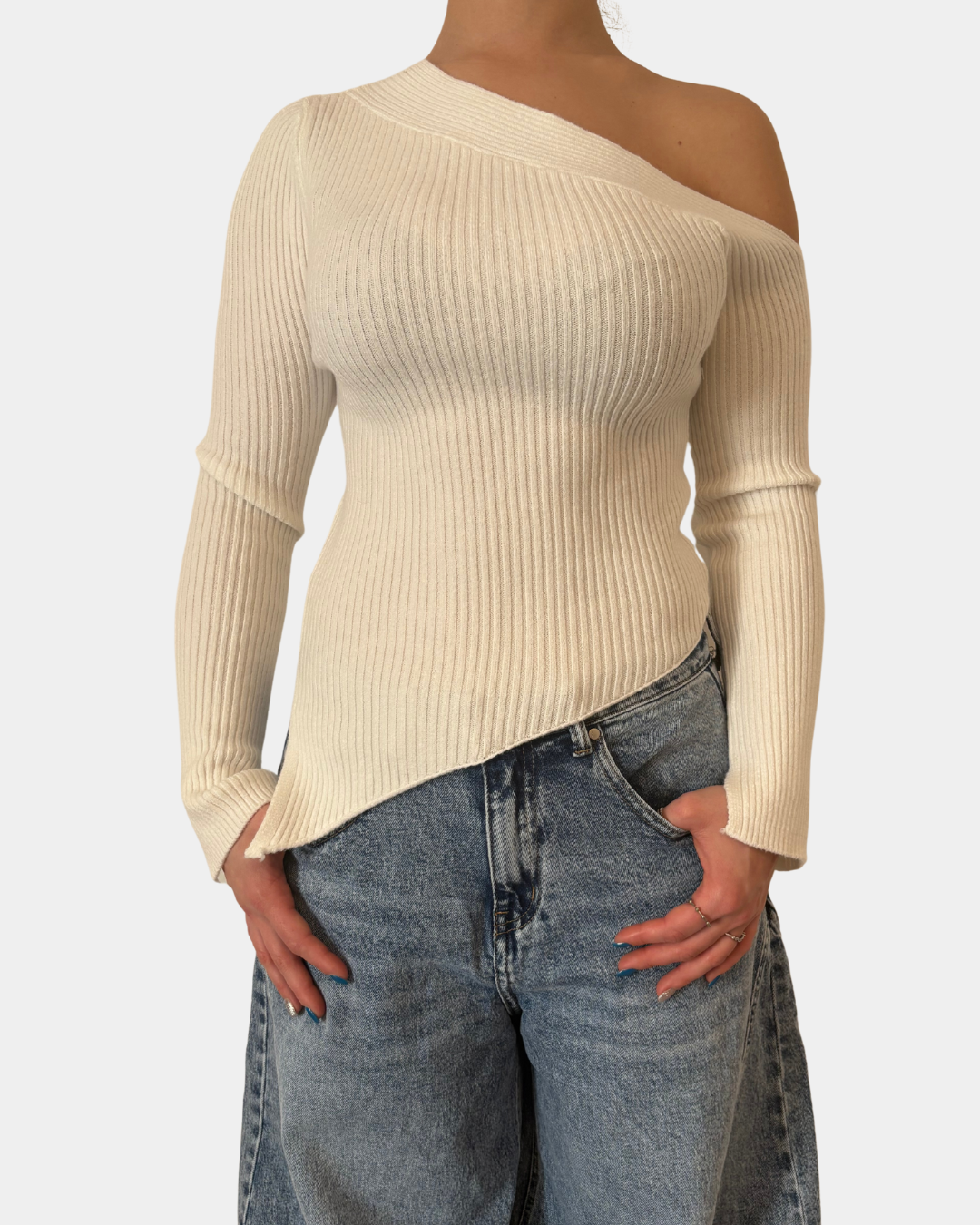 - Maglione a costina, taglio asimmetrico, manica lunga con spacco sul fondo