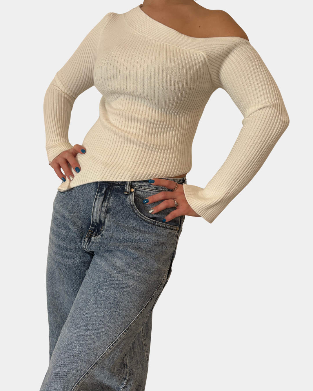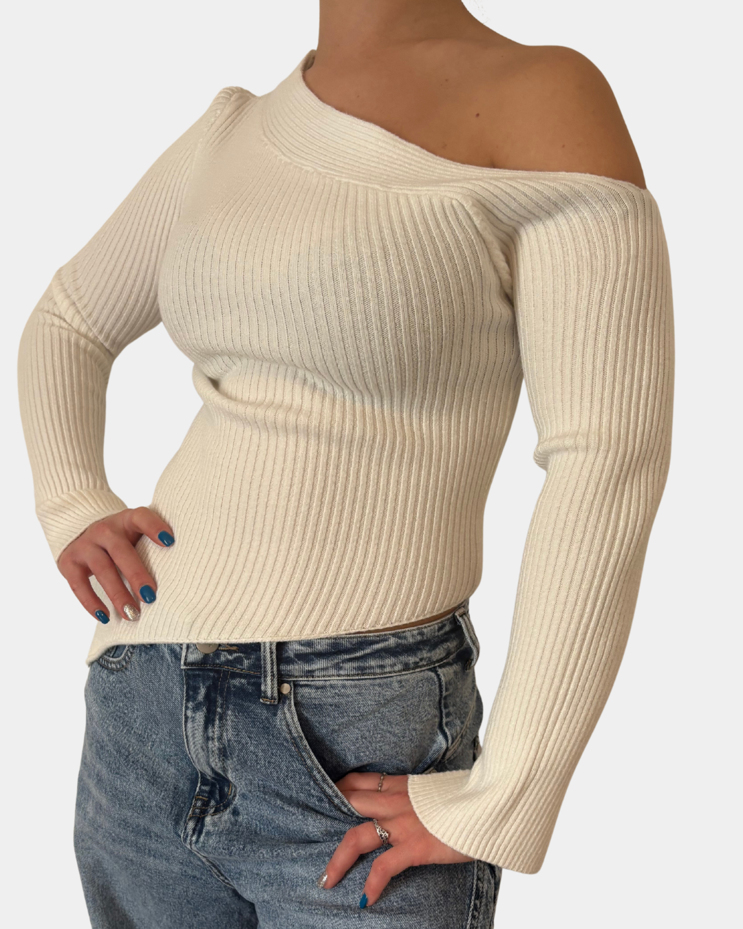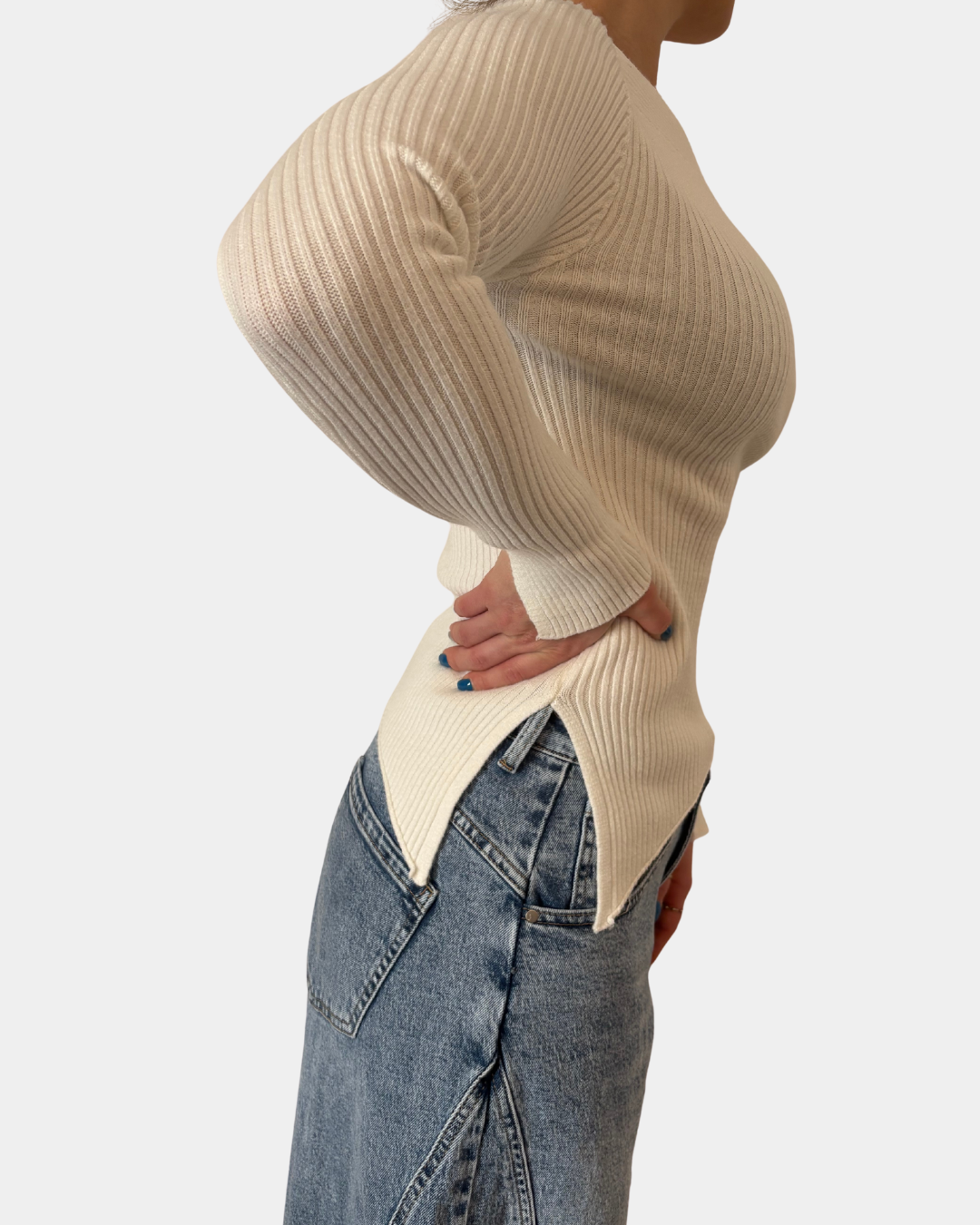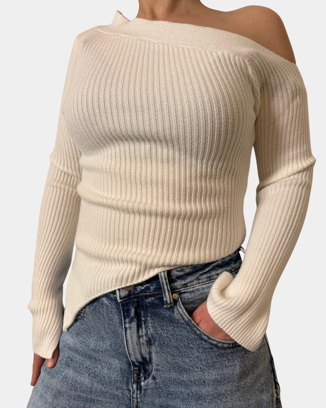 - Maglione a costina, taglio asimmetrico, manica lunga con spacco sul fondo