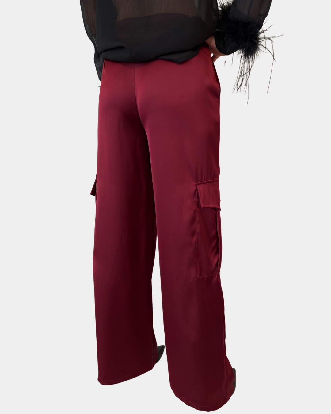 - Pantalone cargo in raso, vita medio alta, gamba dritta, due tasche filetto laterali, chiusura frontale con zip e bottone