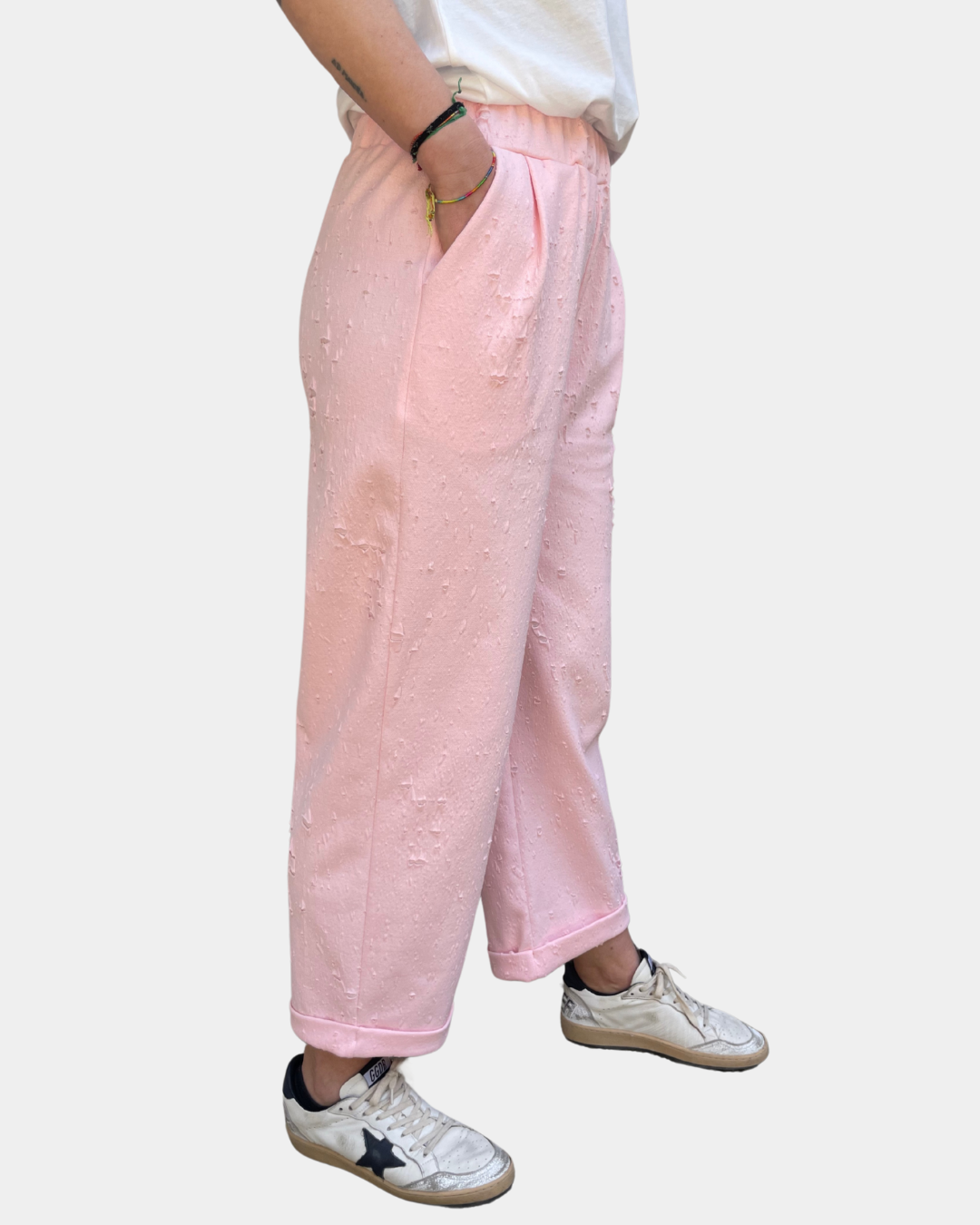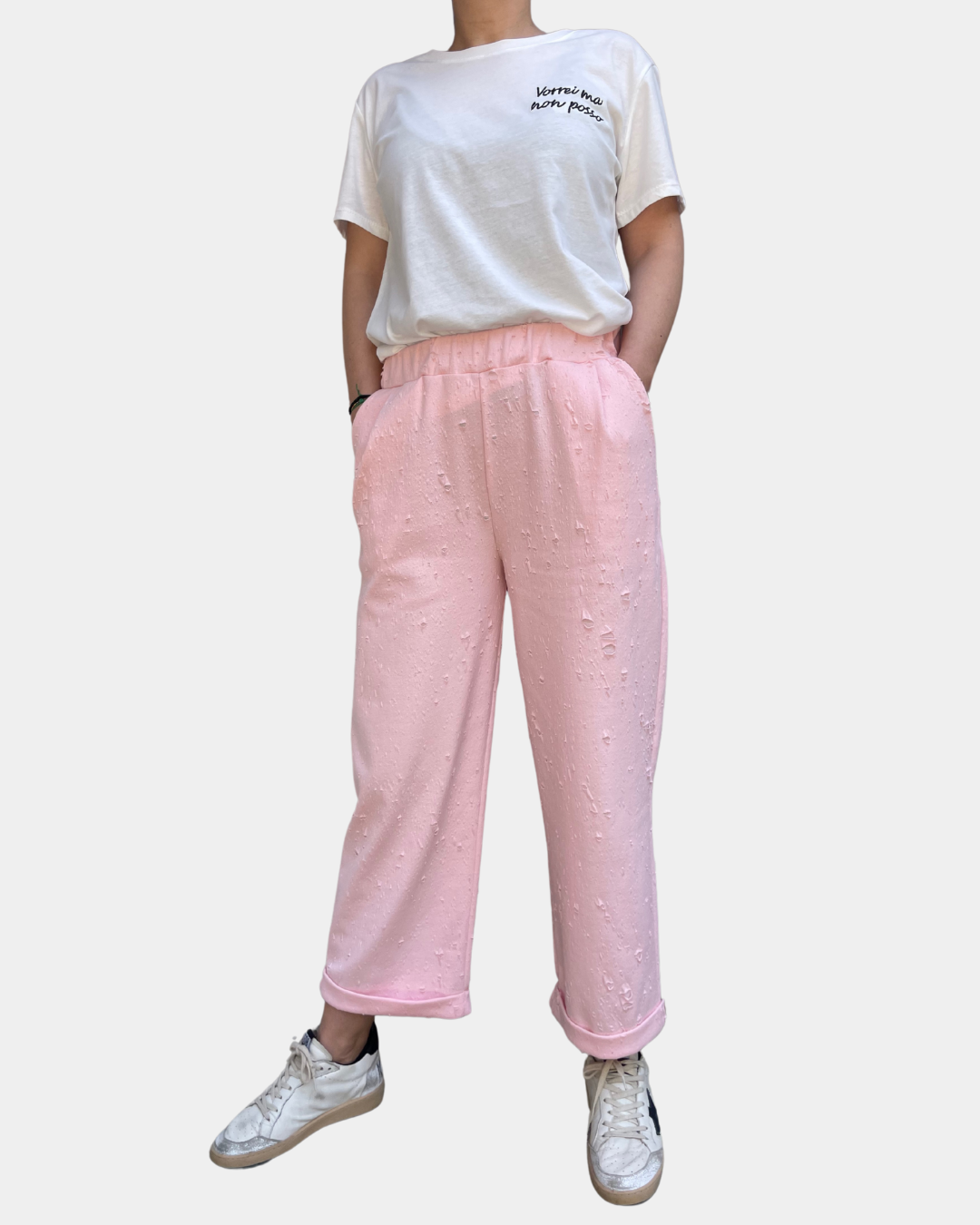 - Pantalone tessuto tesaurizzato, con elastico in vita, gamba morbida, tasche filetto laterali e fondo con risvolto applicato