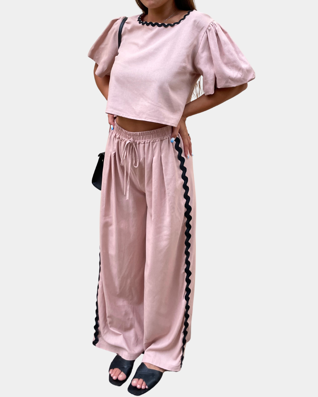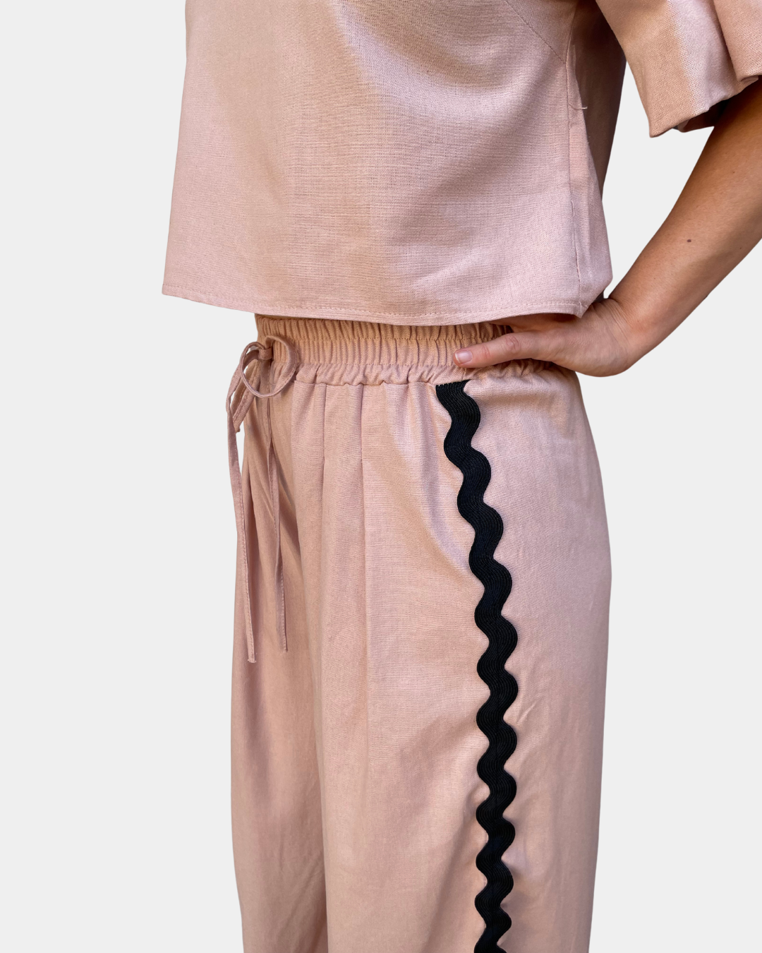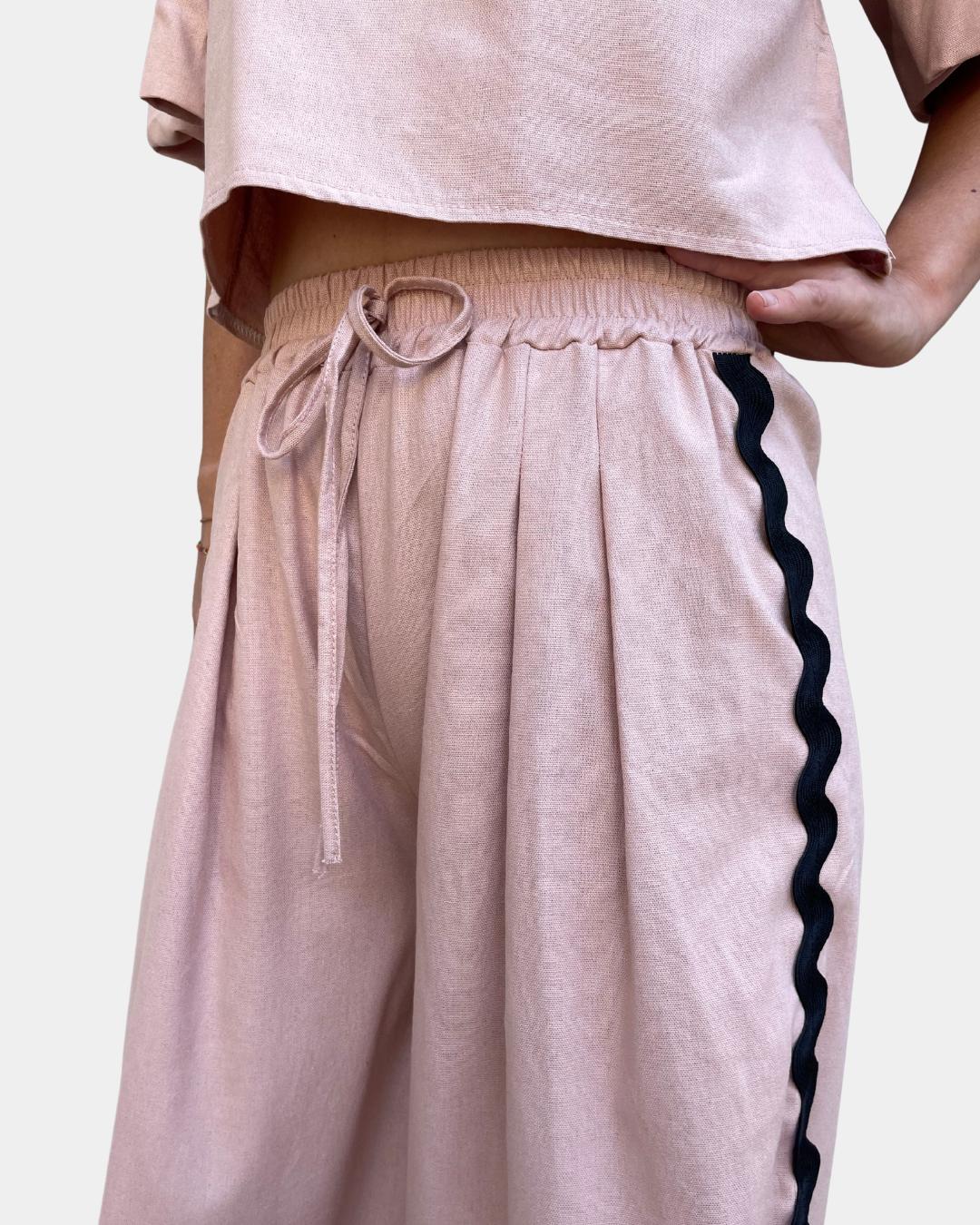 - Pantalone a palazzo con coulisse regolabile in vita, applicazione ondulata a contrasto laterale
