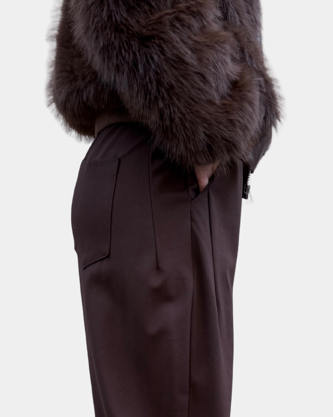 - Pantalone ovetto con elastico in vita, tessuto punto Milano, due tasche filetto laterali e tasca sul retro