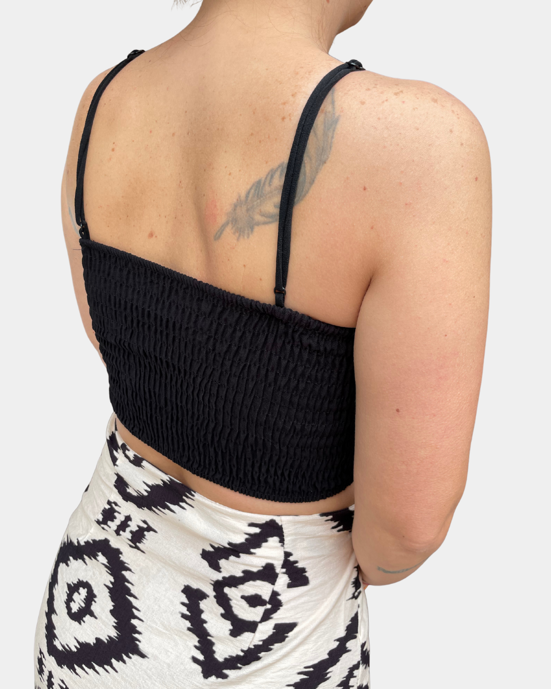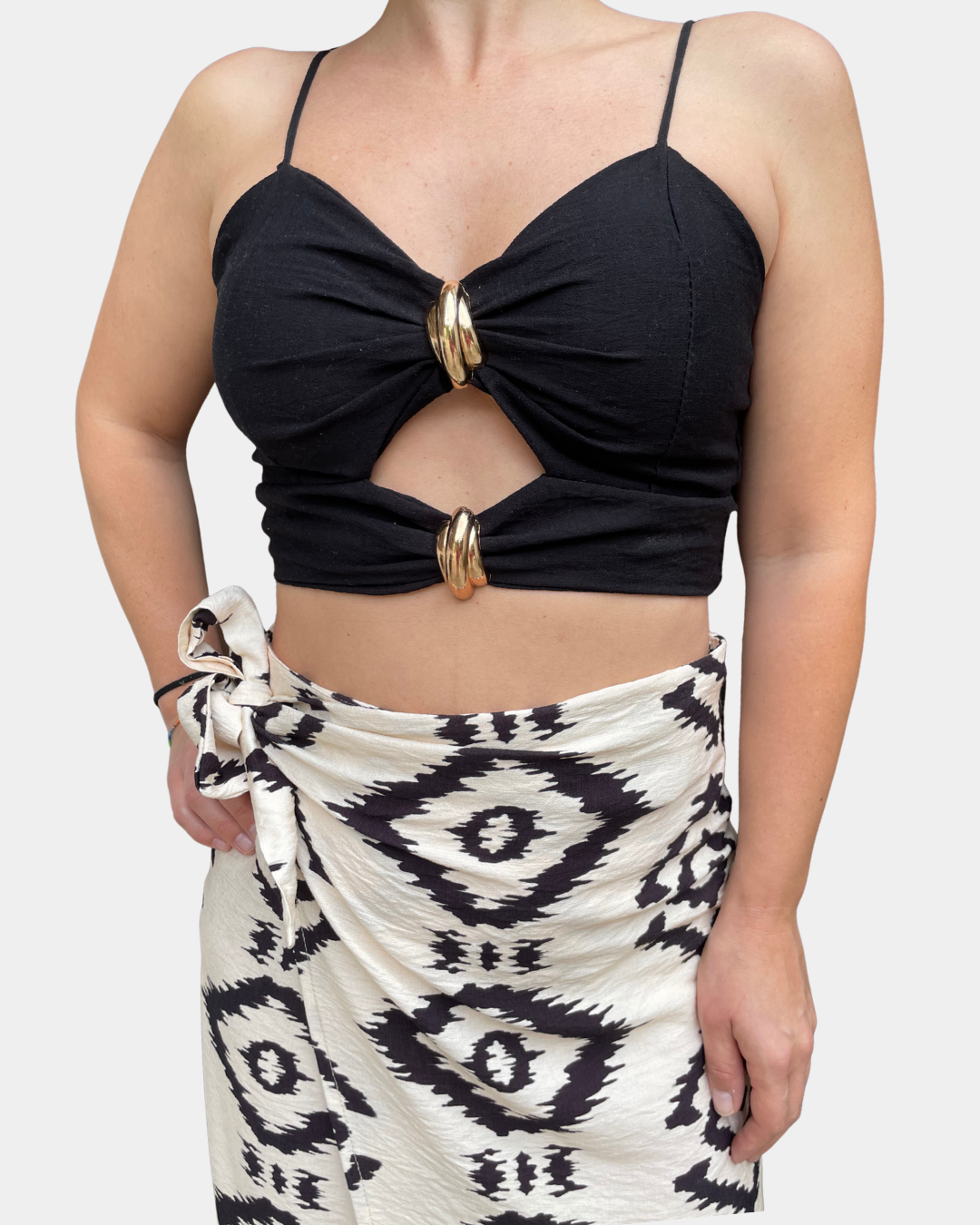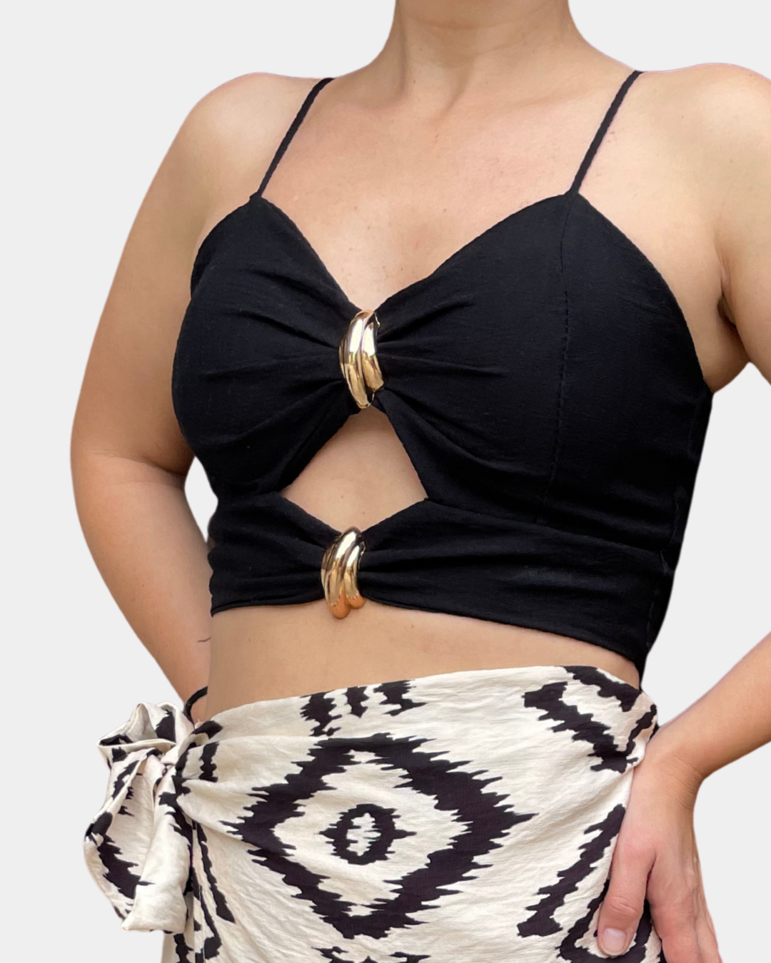 - Top crop, scollo a V con spalline elastiche regolabili, cout out frontale con dettaglio gioiello oro e fascia elastica sul retro