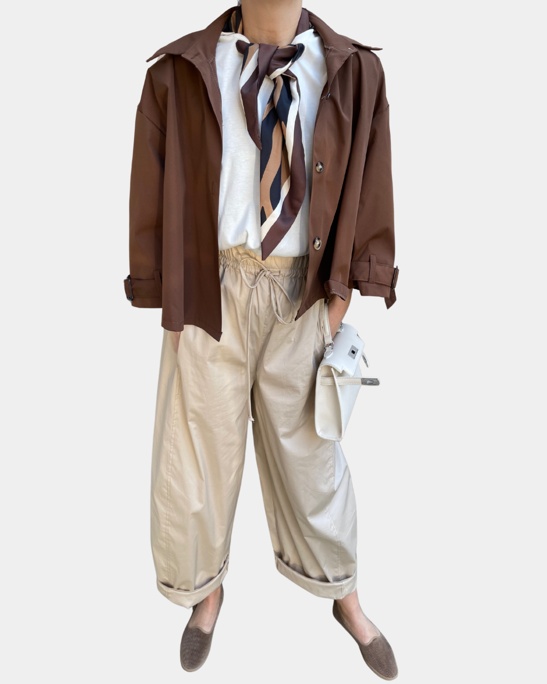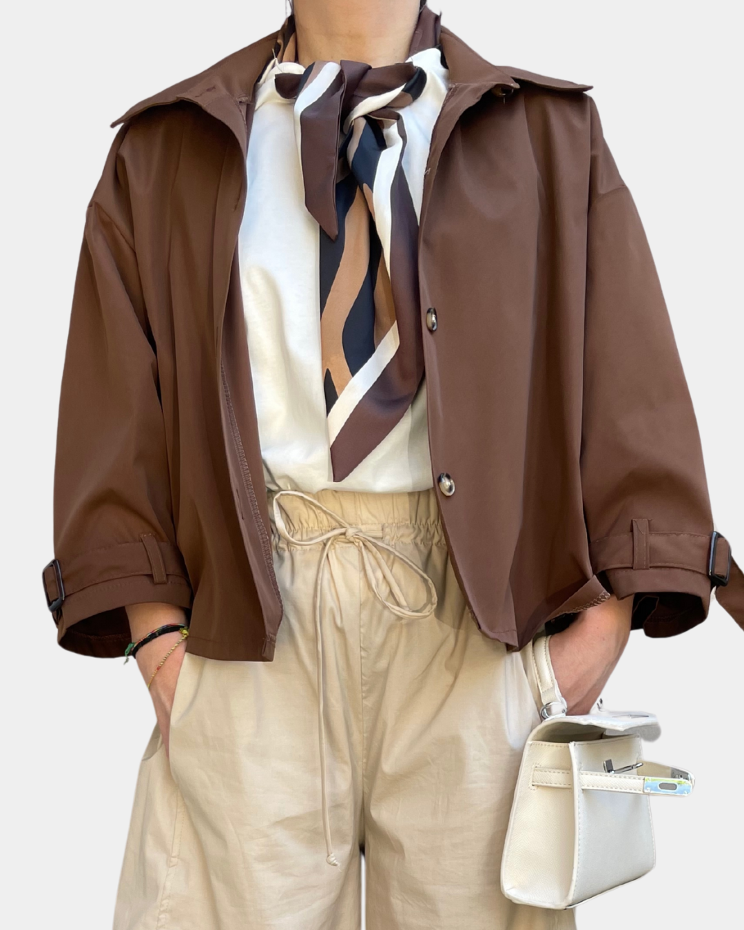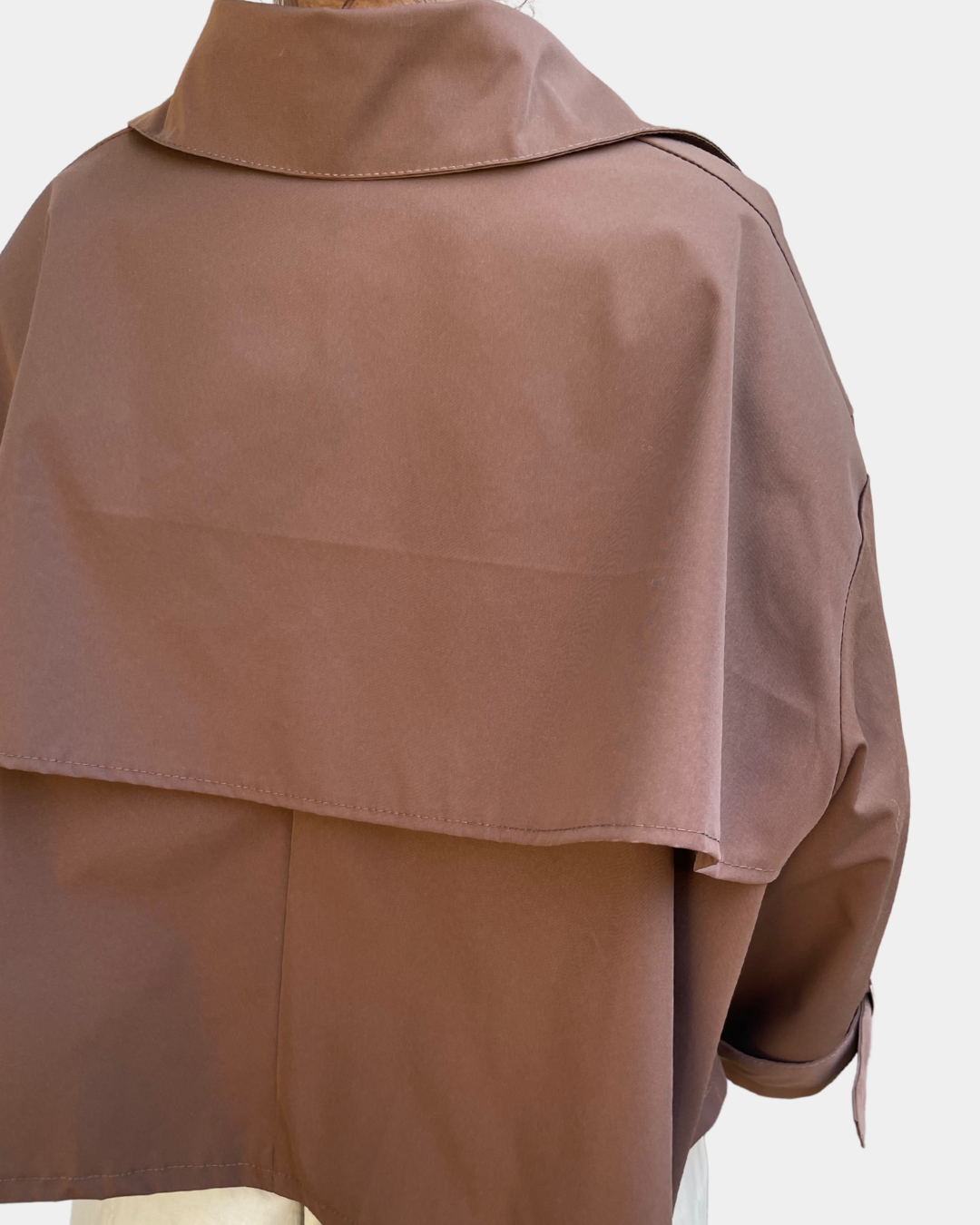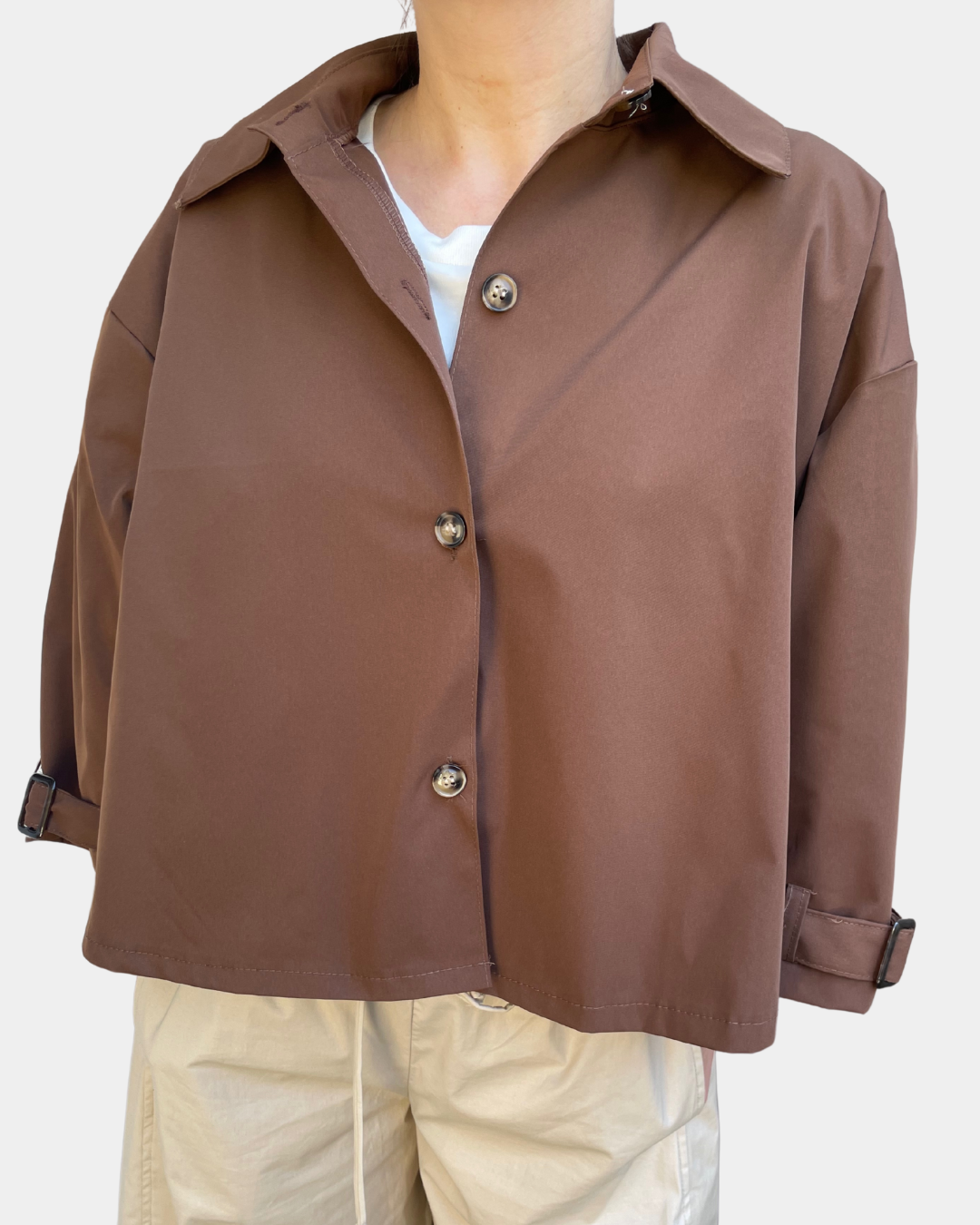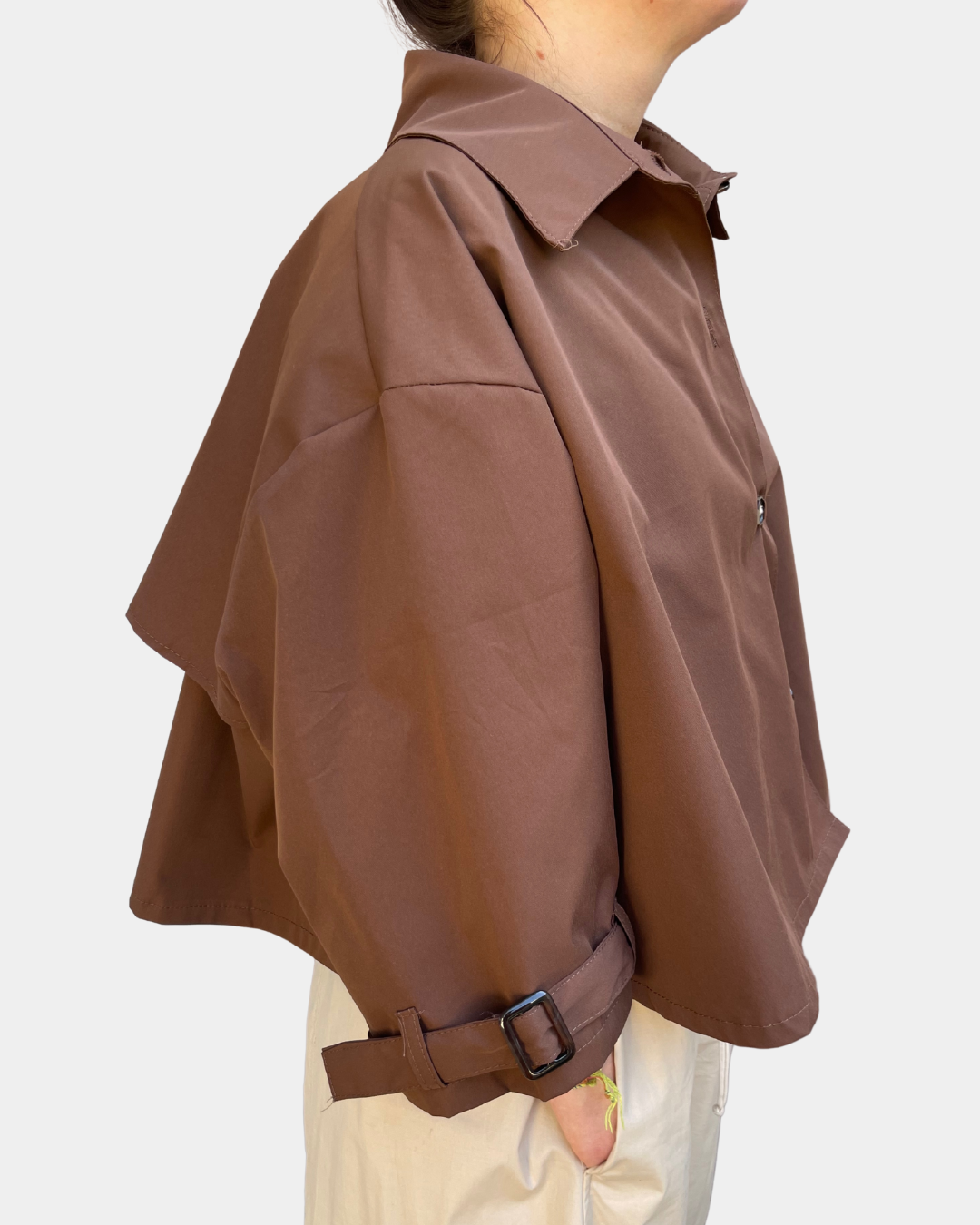 - Trench cropped con abbottonatura frontale, manica a tre quarti regolabile con fibbie
