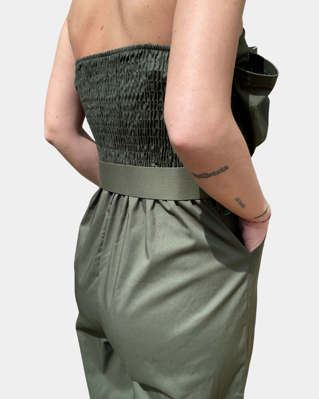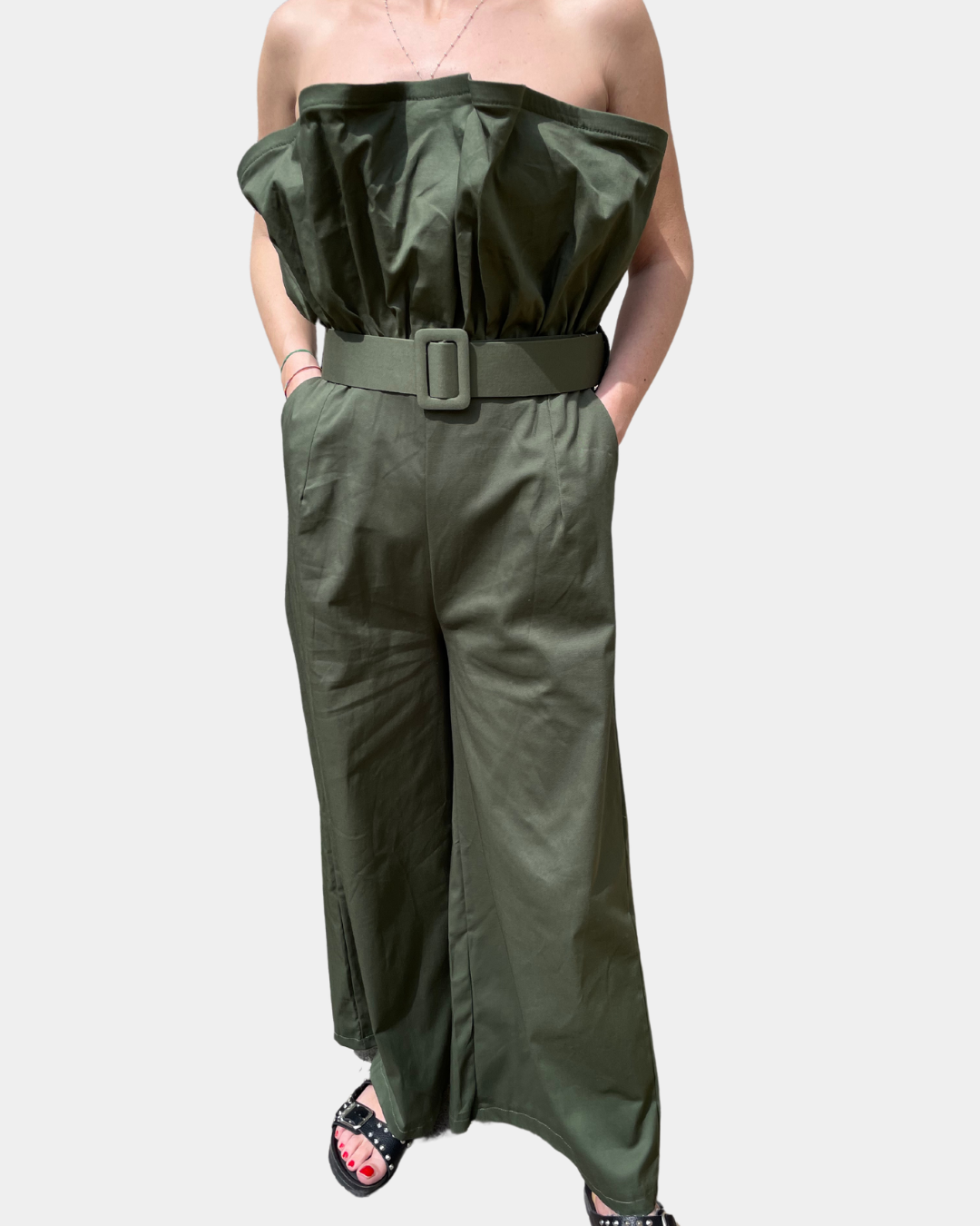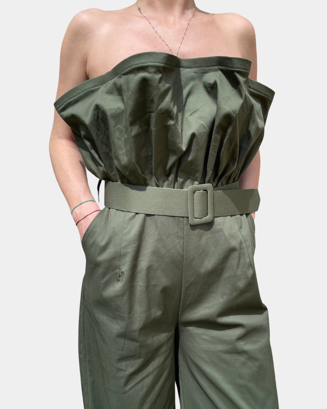 - Tuta intera con rouches, cintura in vita rimovibile e gamba ampia